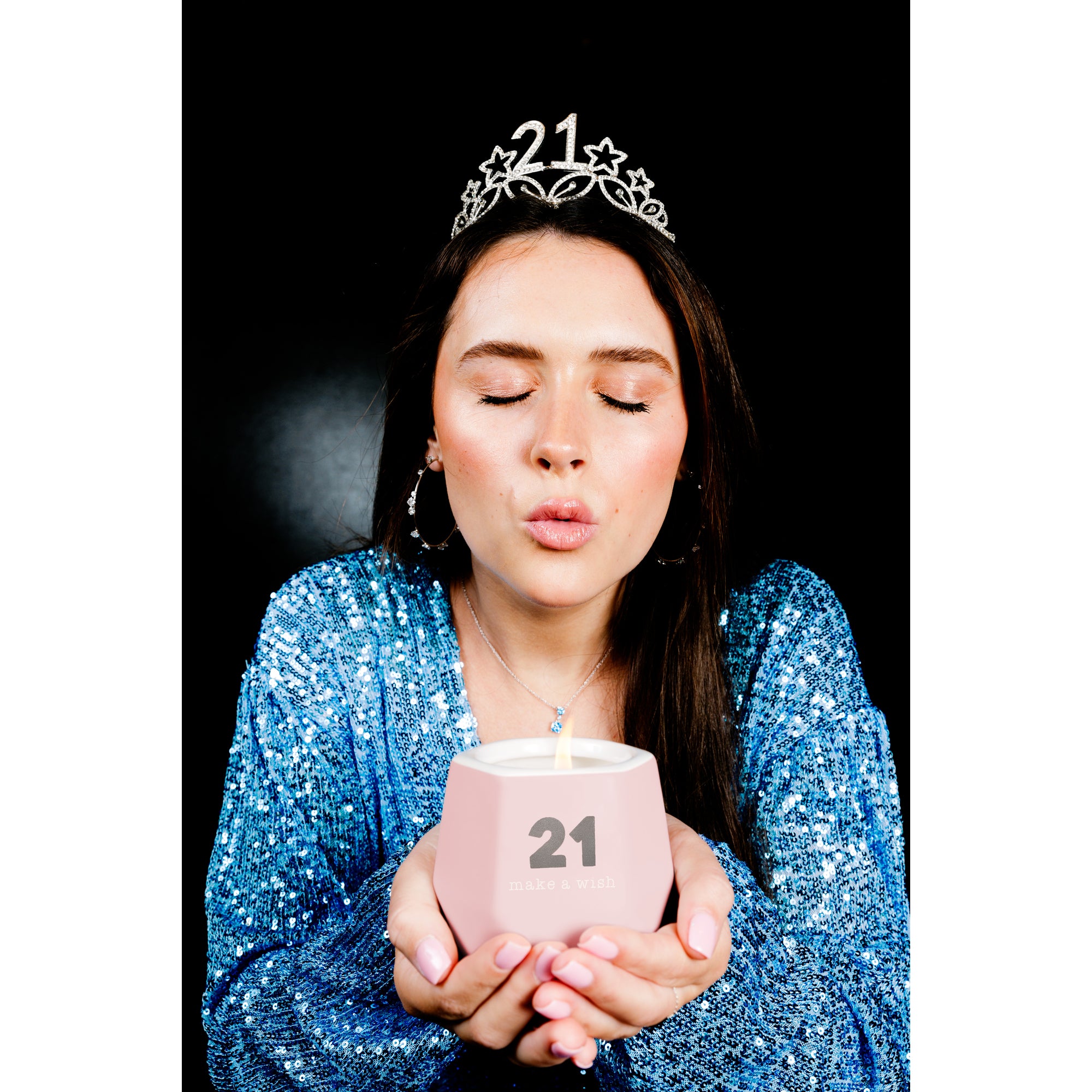 • IN-HOUSE DESIGN: Silver metallic & glossy white "21 Make A Wish" sentiment lines the front center of the geometric candle, which has a six-sided hexagon on the upper two-thirds and a twelve-sided one-third bottom. Always remember to trim your wick down after each burn and burn your candle to the outside for continual even burn.