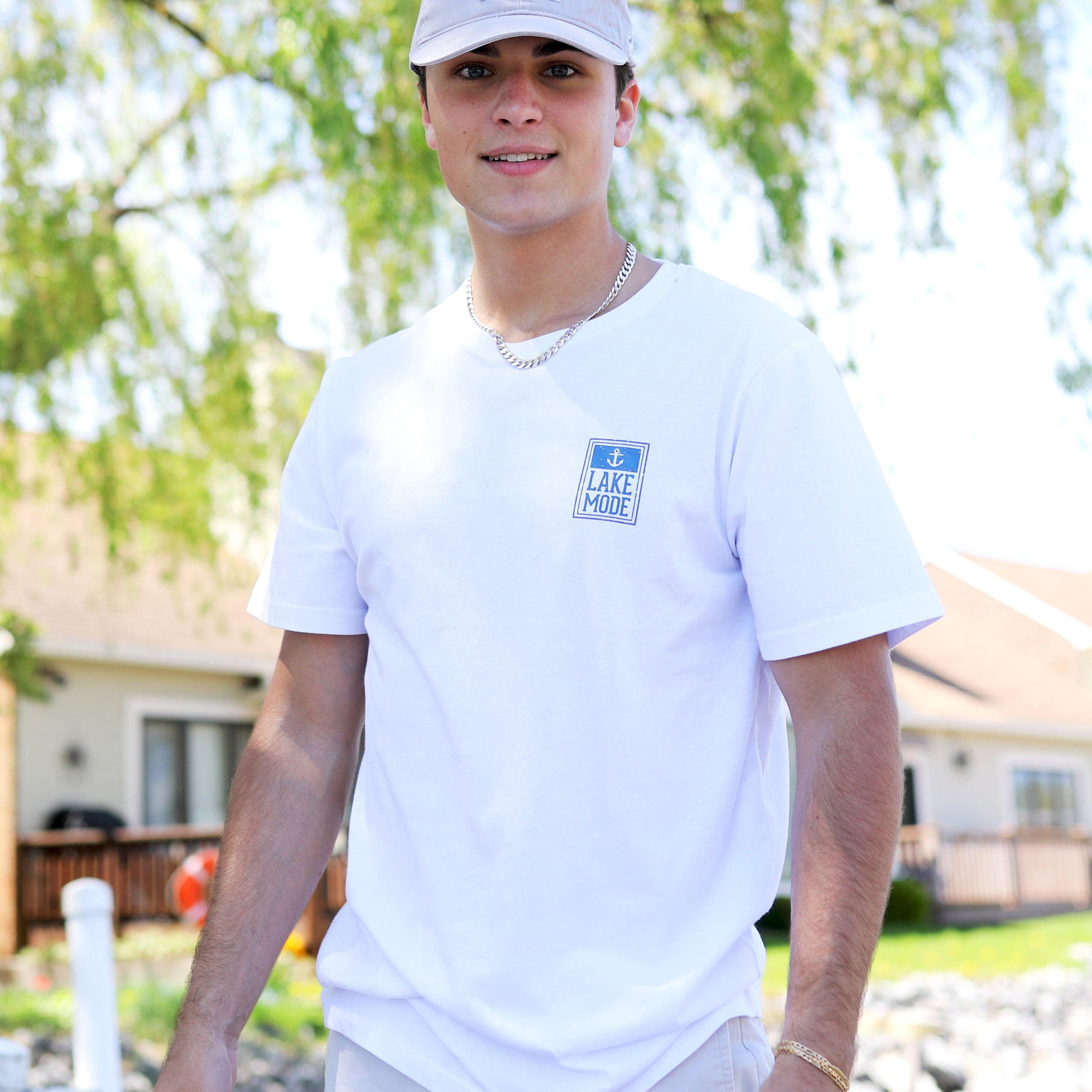 - IN-HOUSE DESIGN: The white shirt has a blue horizontal rectangular shape in the upper left chest area, which contains a white anchor & "LAKE MODE" sentiment inside an outlined design. The backside of the top has "MEANT FOR THE" in gray & "LAKE" in blue that stretches from each edge of the shoulder blade.