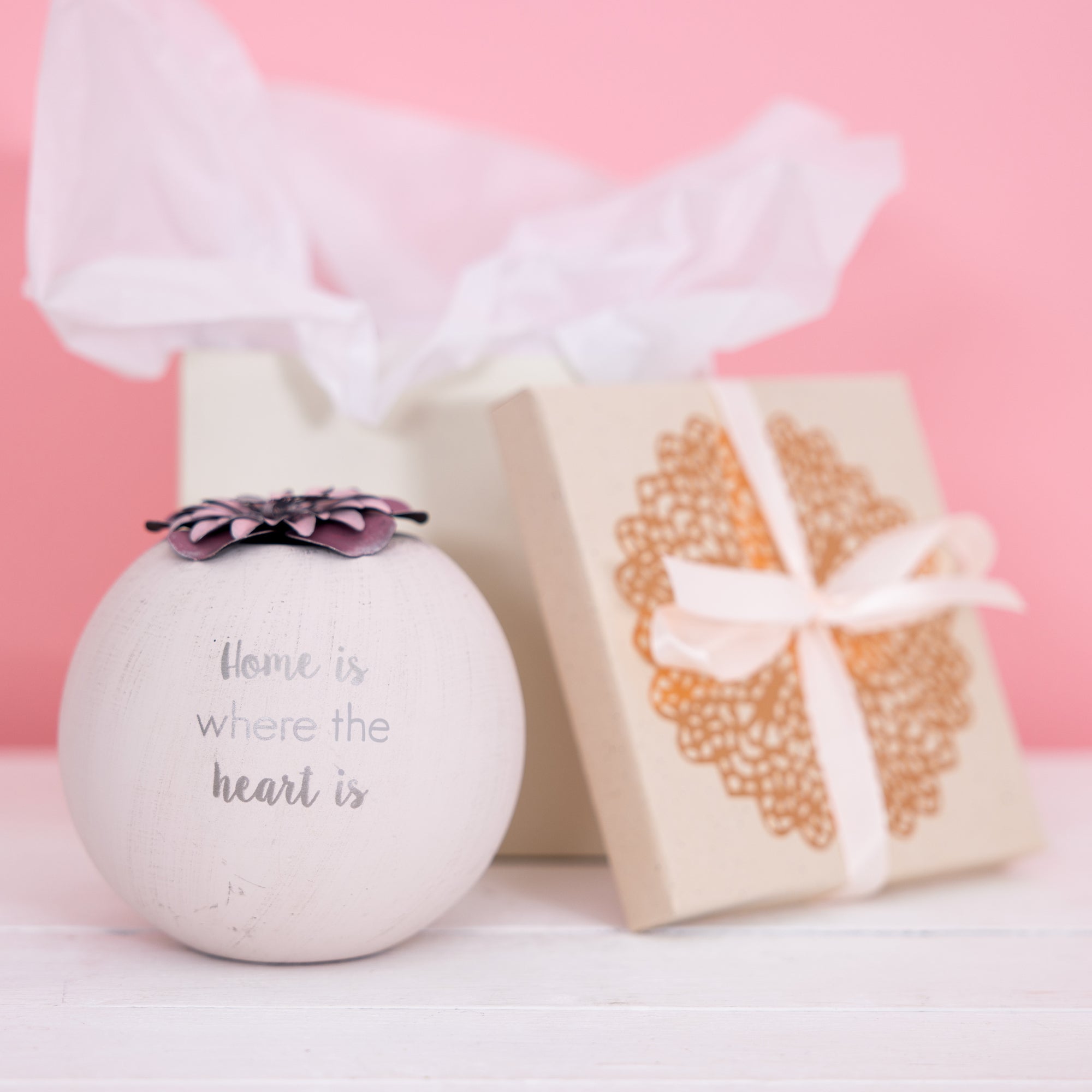 - IN-HOUSE DESIGN: “Home Is Where The Heart Is” text is printed onto the front of the candle holder.
