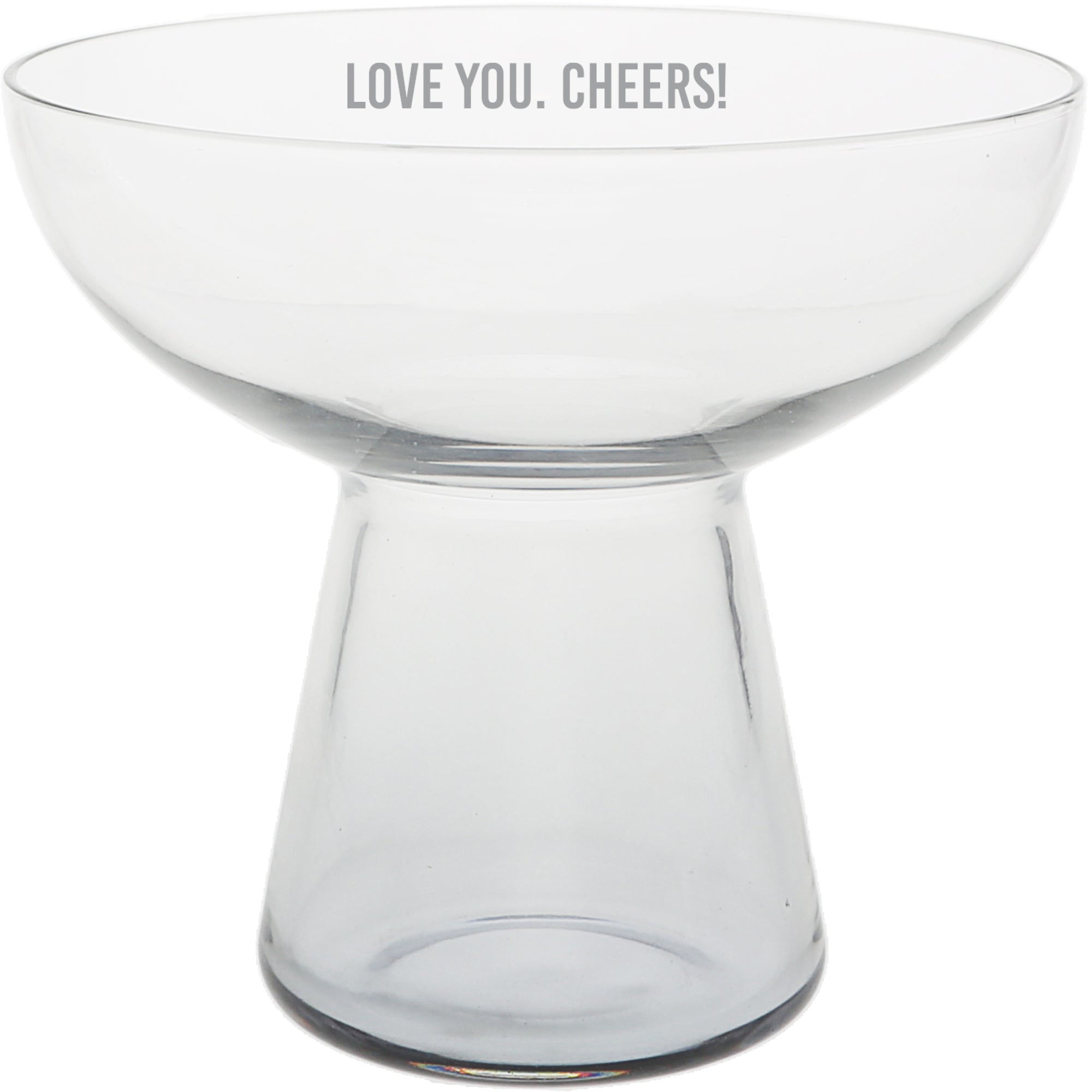 - IN-HOUSE DESIGN: The glass is clear at the top and becomes see-through gray through an ombre fade at the bottom. The sentiment "Love You, Cheers!" is printed on the exterior edge of the back of the brim.