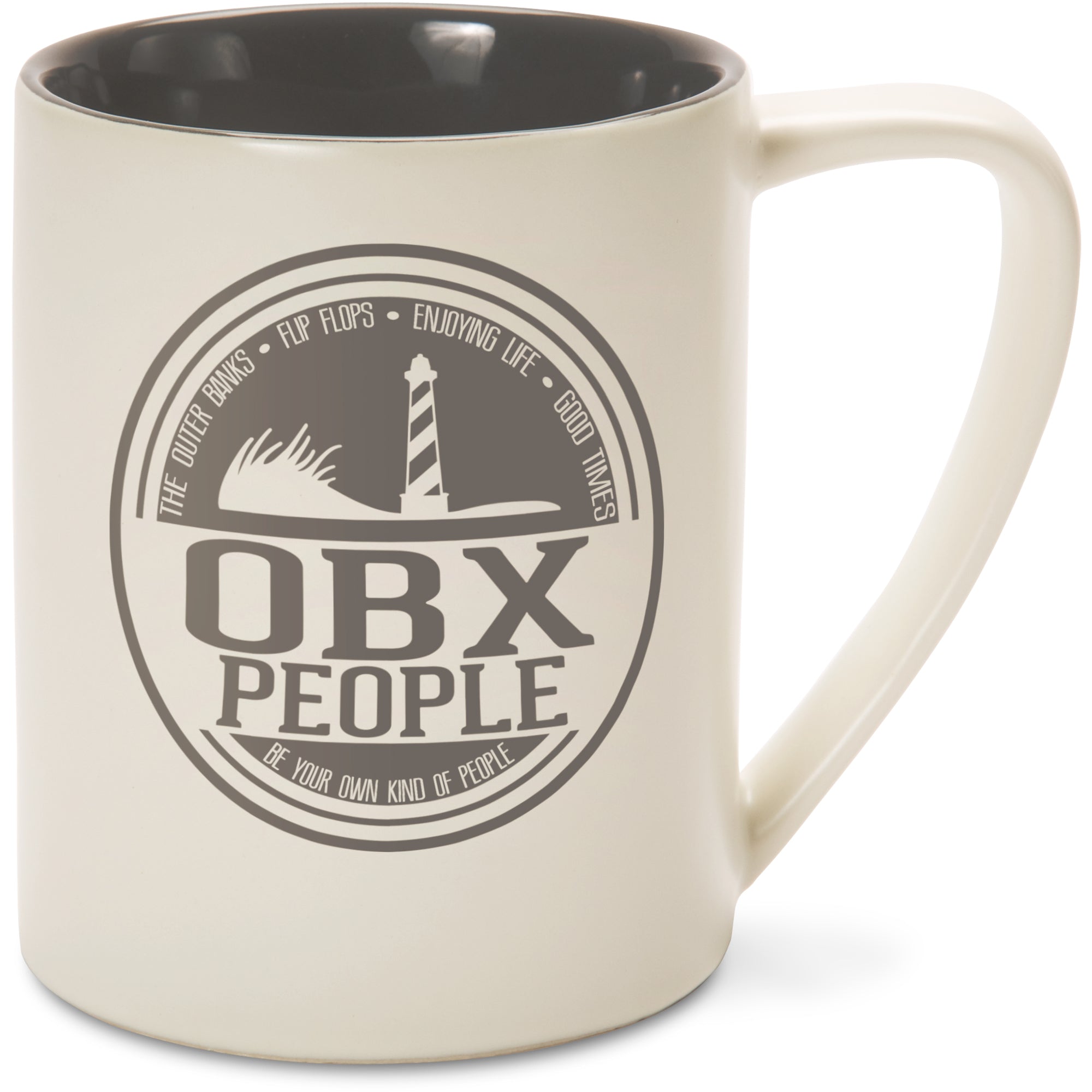 • IN-HOUSE DESIGN: "OBX People" decal, including "The Outer Banks - Flip Flops - Enjoying Life - Good Times" text is printed on both sides of the mug, as are the accompanying lighthouse and sand logo and "Be Your Own Kind Of People" text.