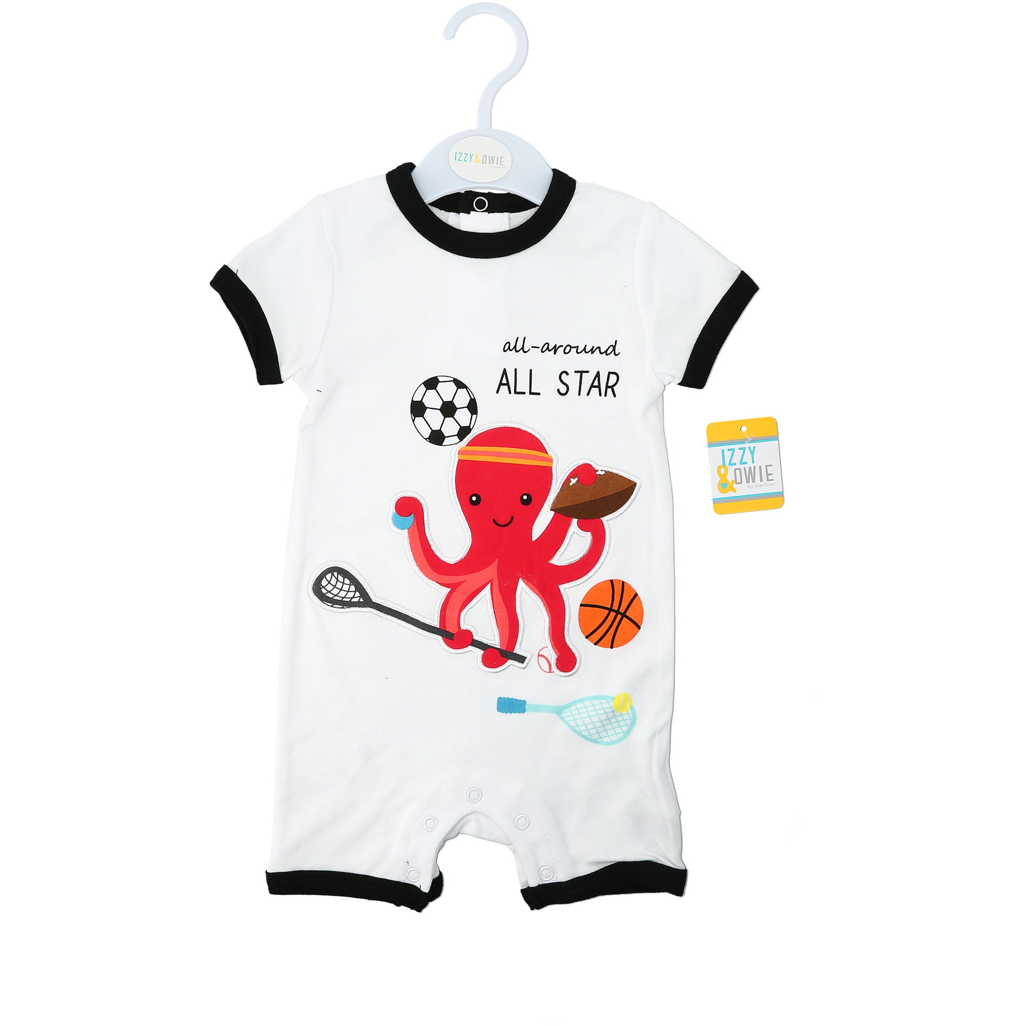 - IN-HOUSE DESIGN: Short sleeve 100% cotton romper is the perfect addition to your little ones' wardrobe. Two snaps at the back of the neck ensure a comfortable and secure fit. The bottom crotch area has five snaps, making it on and off easy and quick. Sleeves, neckline, and bottom-of-leg openings are trimmed with a soft coordinating trim for style and durability.