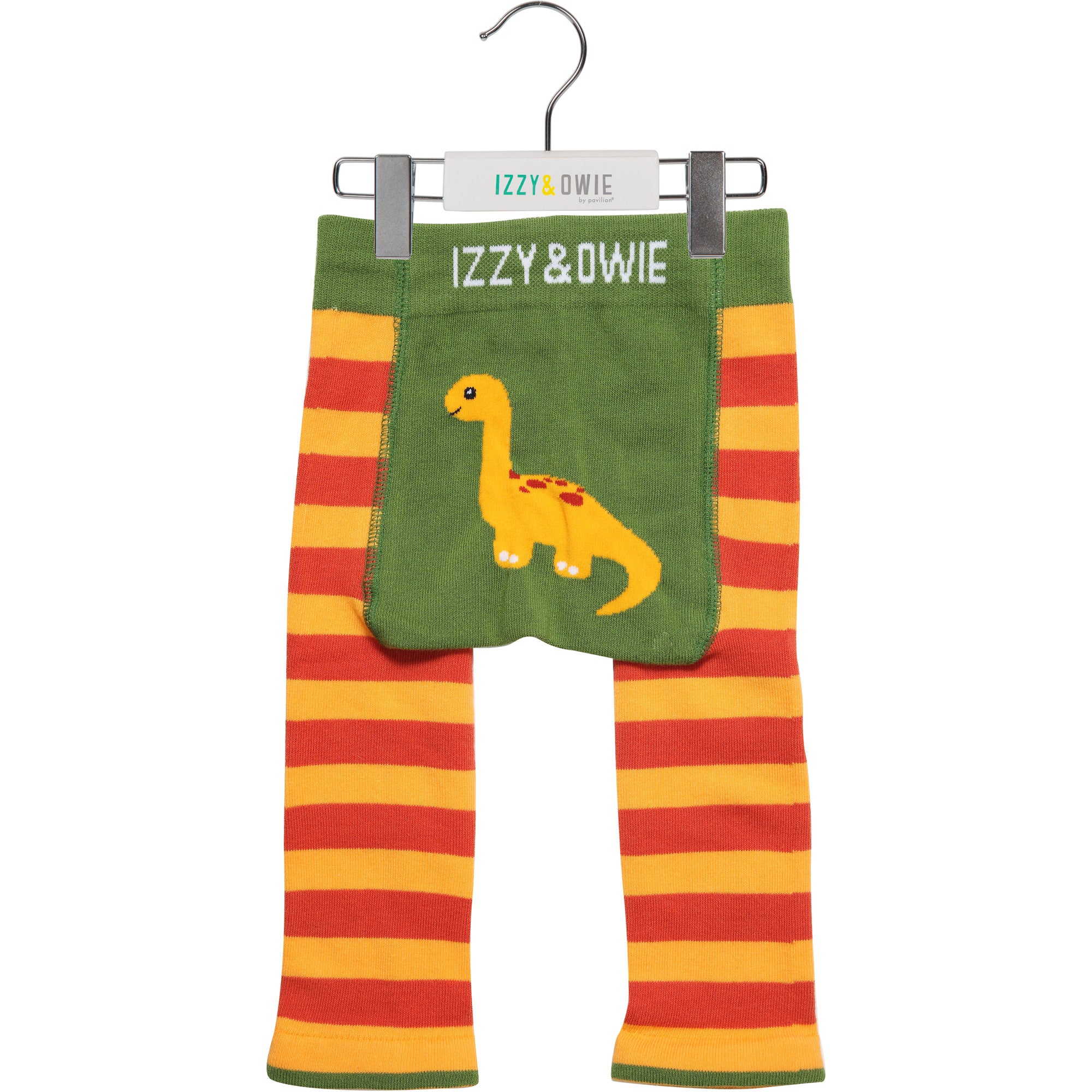 - IN-HOUSE DESIGN: "Izzy & Owie" text is sewn into the waistband, dinosaur image is sewn into the rear, and the stripe pattern of the main material covers the rest of the leggings.