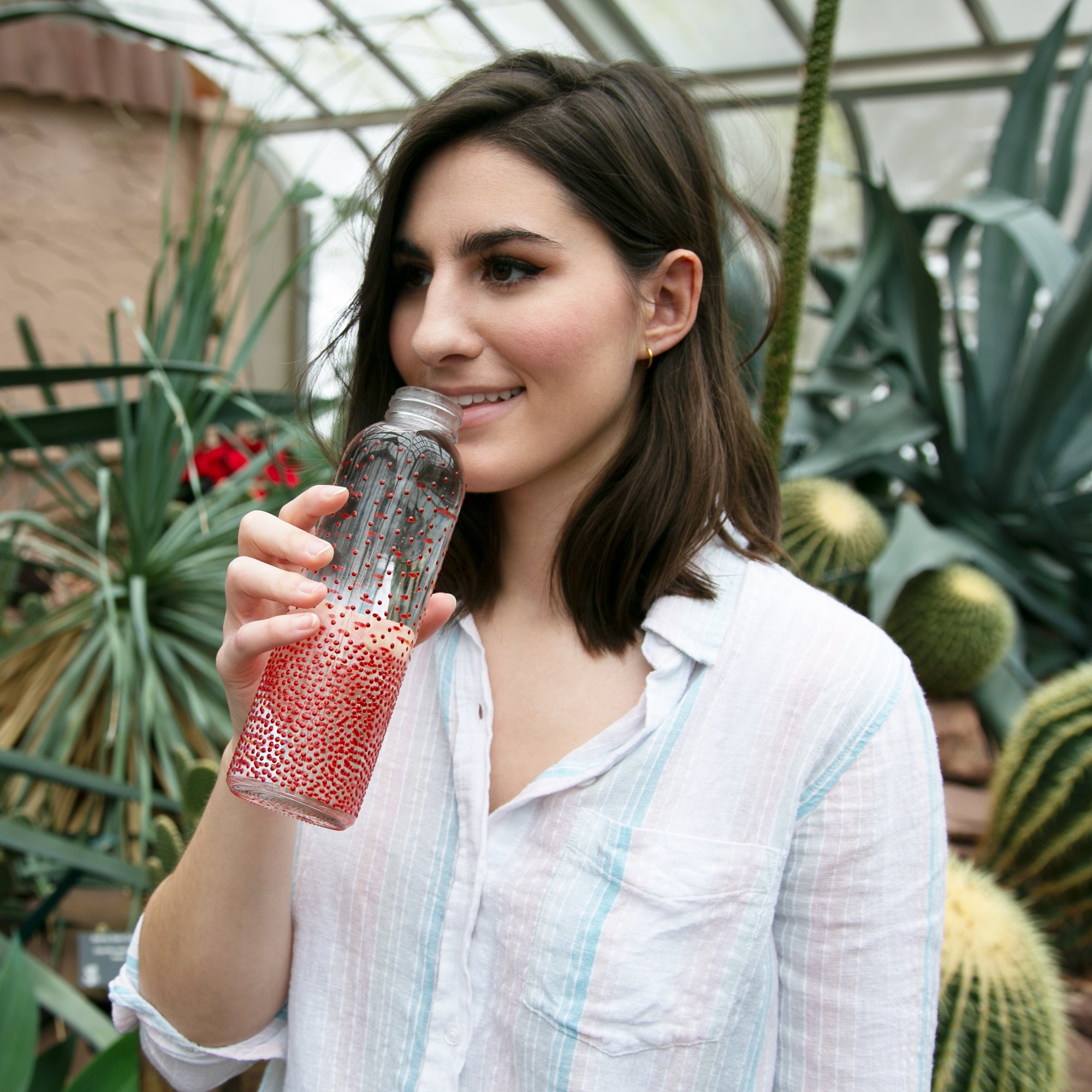 - PREMIUM QUALITY: 16.5oz water bottle, packaged in a printed open-faced box with information about the artist and suggested recipes, is made from glass and metal and features a ribbon handle and a rubber seal.