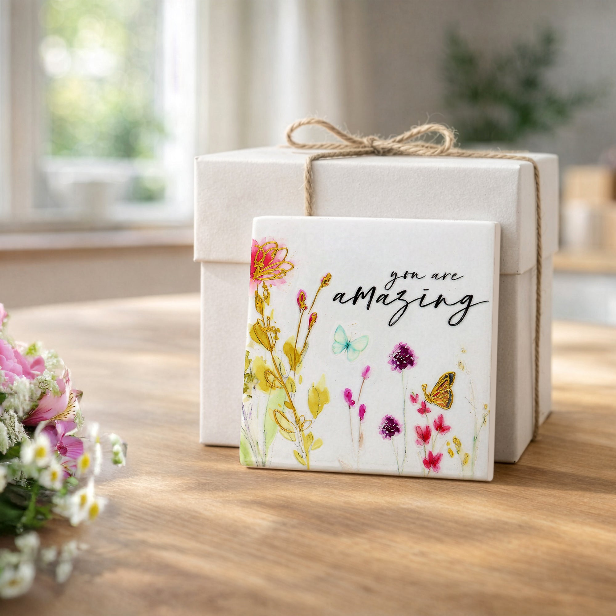 - PREMIUM QUALITY: Crafted from ceramic with a glossy finish, this 4" x 4" coaster features vibrant floral art, butterflies, and gold-embossed text reading “You are amazing.” The cork backing provides non-slip support and protects surfaces. The design combines artful color and gentle inspiration for everyday encouragement.
