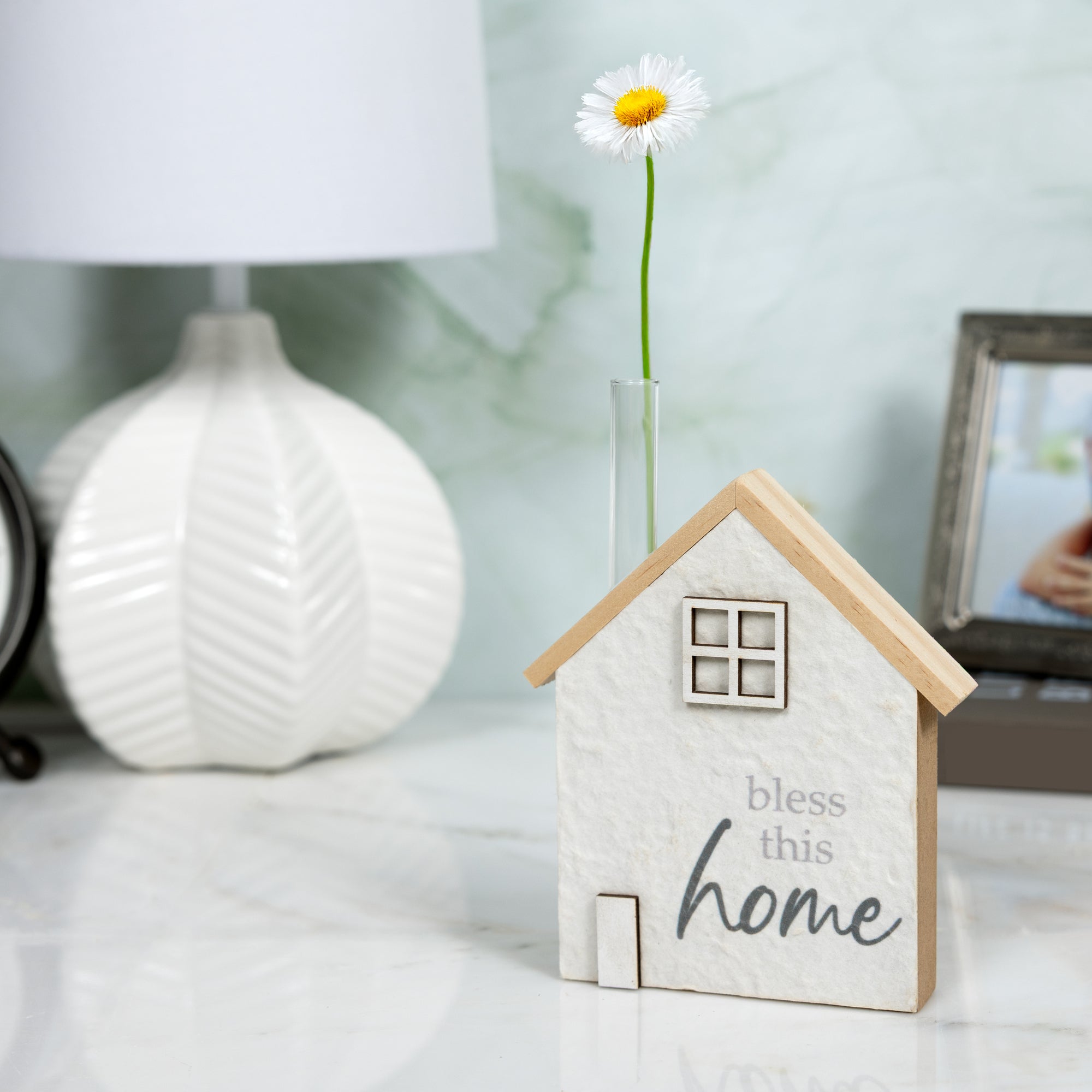 • PREMIUM QUALITY: Made from durable pinewood and MDF, this 5" house-shaped plaque features a minimalist white facade with printed text and cutout window accents. Includes a removable glass tube vase for holding faux or fresh greenery.