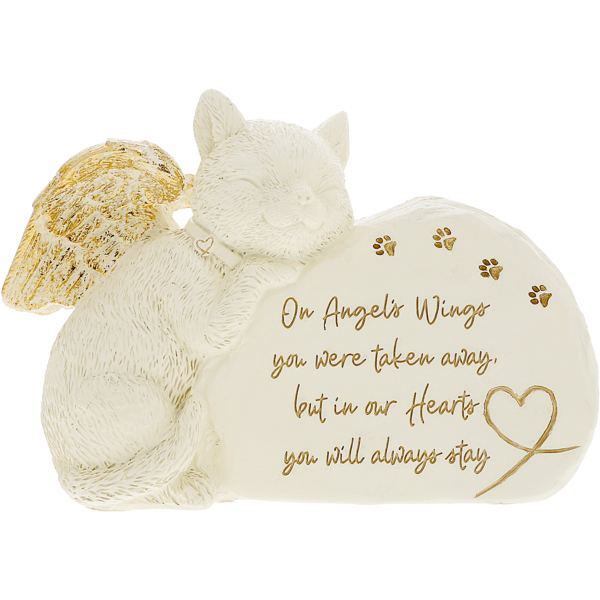 - IN-HOUSE DESIGN: The stone bears a heartfelt sentiment: "On Angels Wings You Were Taken Away, But In Our Hearts You Will Always Stay." The shiny gold painted debossed text is a poignant reminder of the enduring love and cherished memories shared with your Feline kitten kitty. Adding to its beauty, the resting cat has gold-foiled wings and a golden heart collar, and it accompanies a trail of pawprints and another heart on the rock. Symbolizing the presence of loved ones watching over us. This memorial stone can be placed in your garden or any sacred space, providing solace and a lasting tribute to the eternal bond you shared with your furry friend.