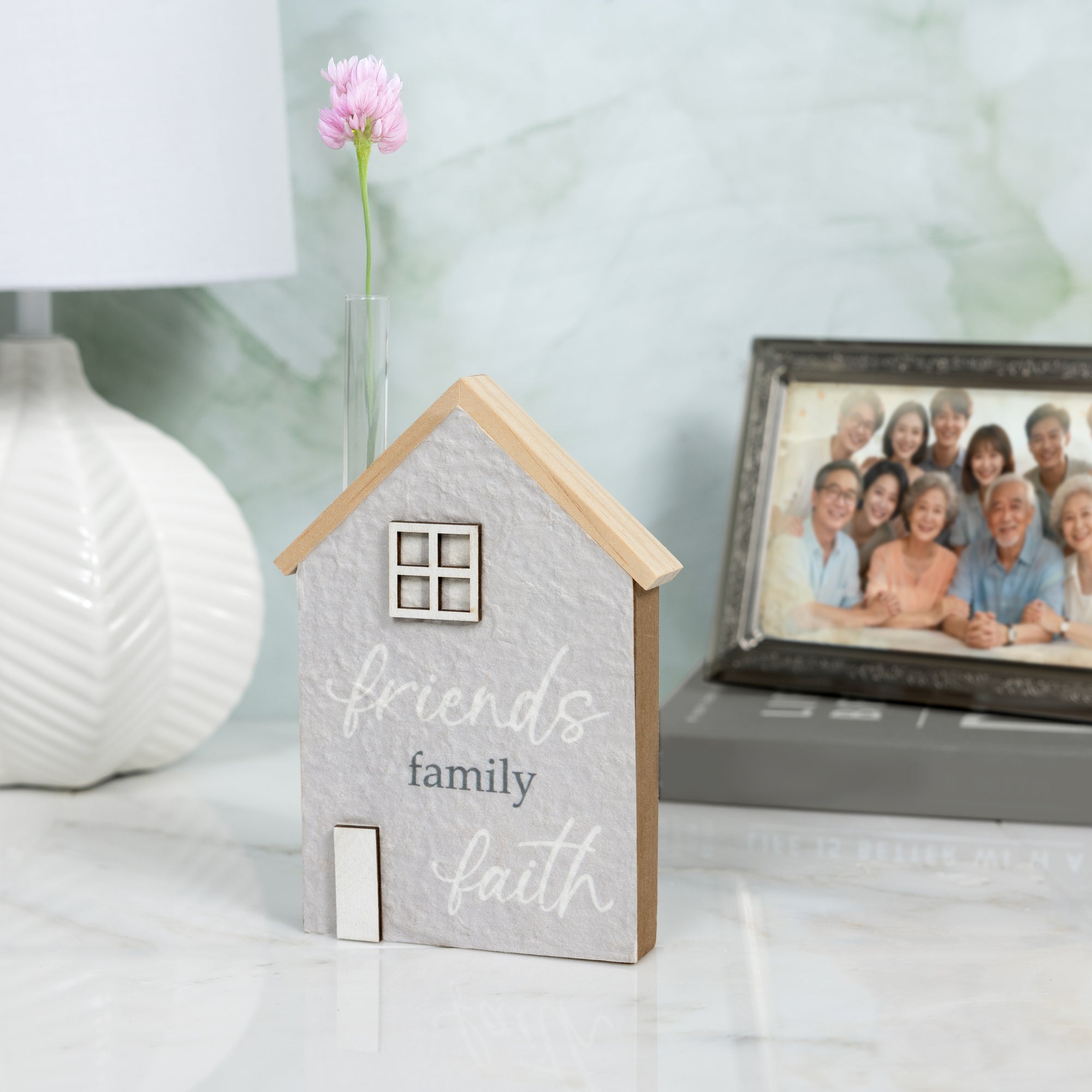 - IN-HOUSE DESIGN: Displays the meaningful words “friends, family, faith” stacked in graceful white script—paired with a cozy house shape that complements farmhouse, modern, or transitional décor styles.
