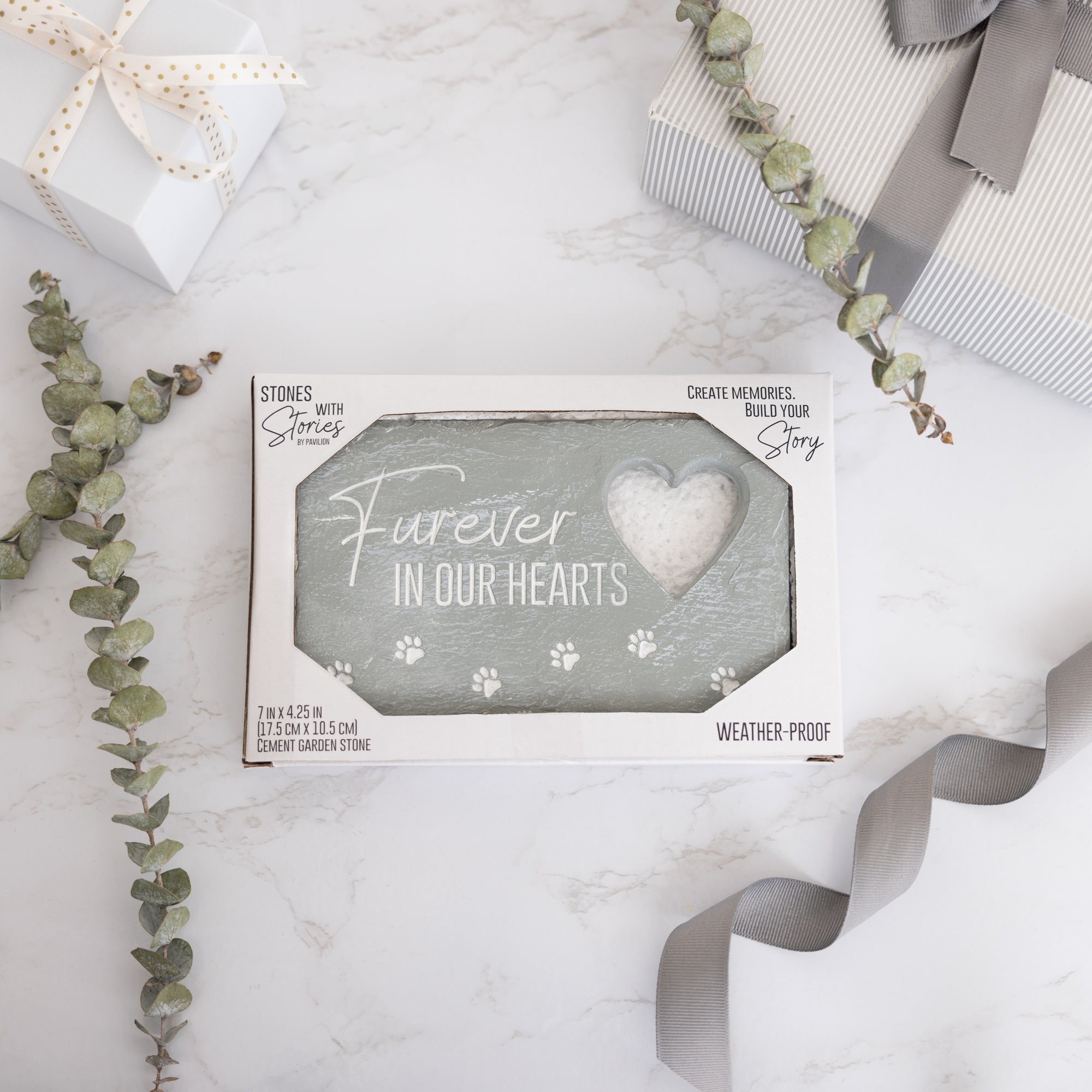 - IN-HOUSE DESIGN: This light gray stone has a textured surface and rounded edges. It features pawprints, a cut-out heat, and the sentiment "Furever In Our Hearts." This charming stone adds a touch of warmth and love to any outdoor or indoor space, serving as a meaningful reminder of the welcoming atmosphere within your home.