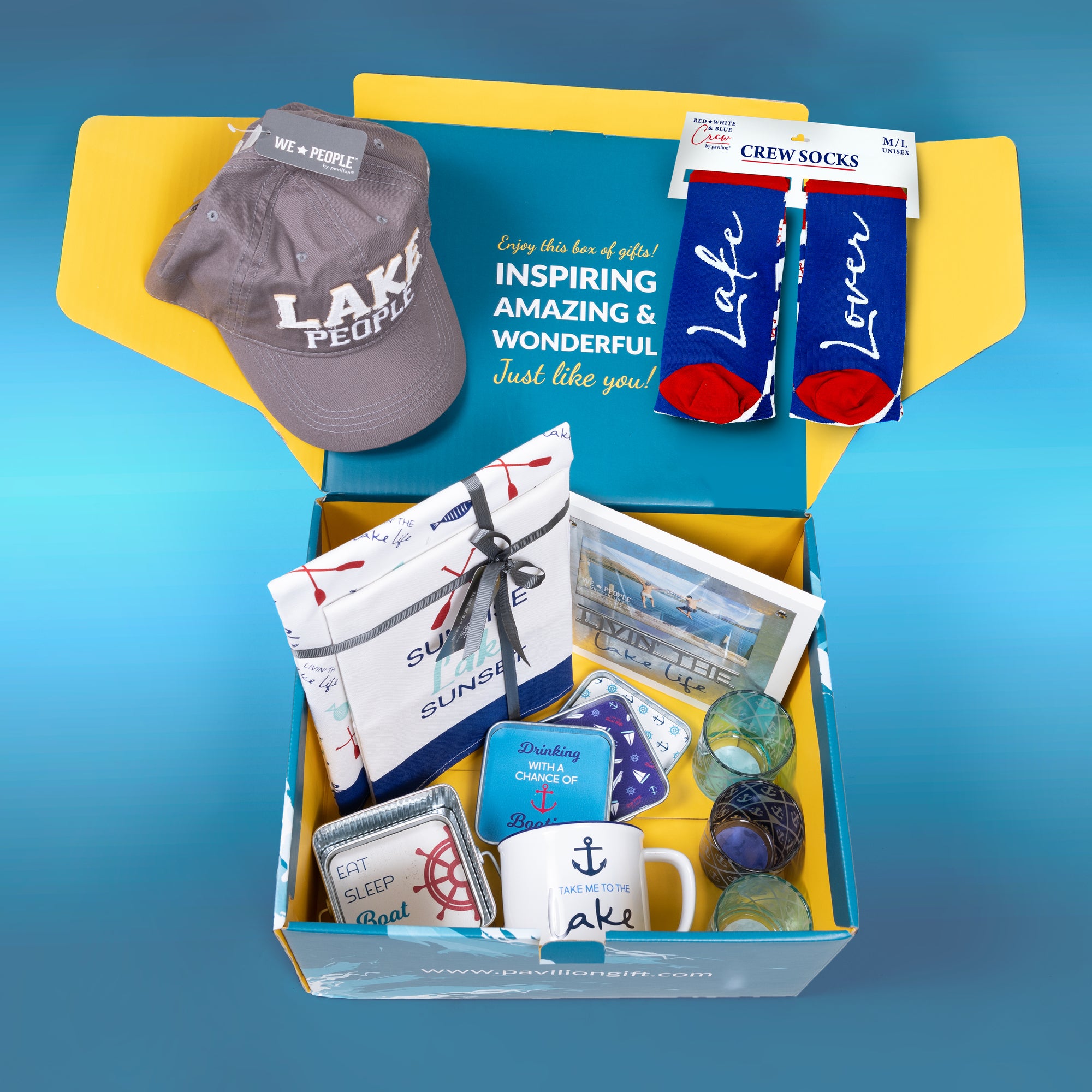 - PRODUCTS: Includes a lake themed baseball hat, 3 votive holders, tea towel set of 2, 17 oz. mug, picture frame, socks and a 4 piece coaster set. See the description tab on the bottom left for details on each one of the wonderful carefully packaged gifts including material, care instructions, and packaging.