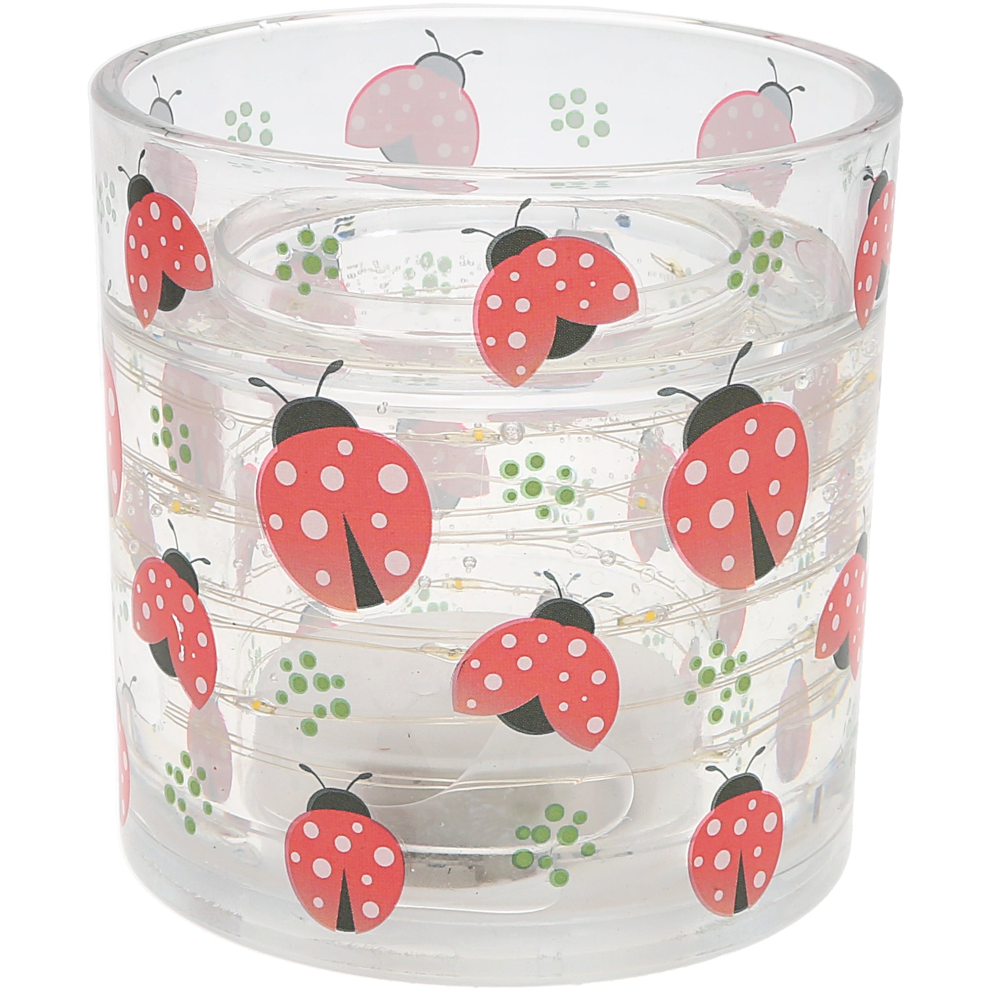 - PREMIUM QUALITY: This 3.5 oz glass candle features unscented 100% soy wax surrounded by heat-activated LED lights suspended in clear gel. As the candle warms, the LEDs create a soft, comforting glow without added fragrance. Durable printed glass artwork includes vibrant ladybugs and greenery. Packaged with a printed band and plain acetate cover inside a protective white die-cut box.