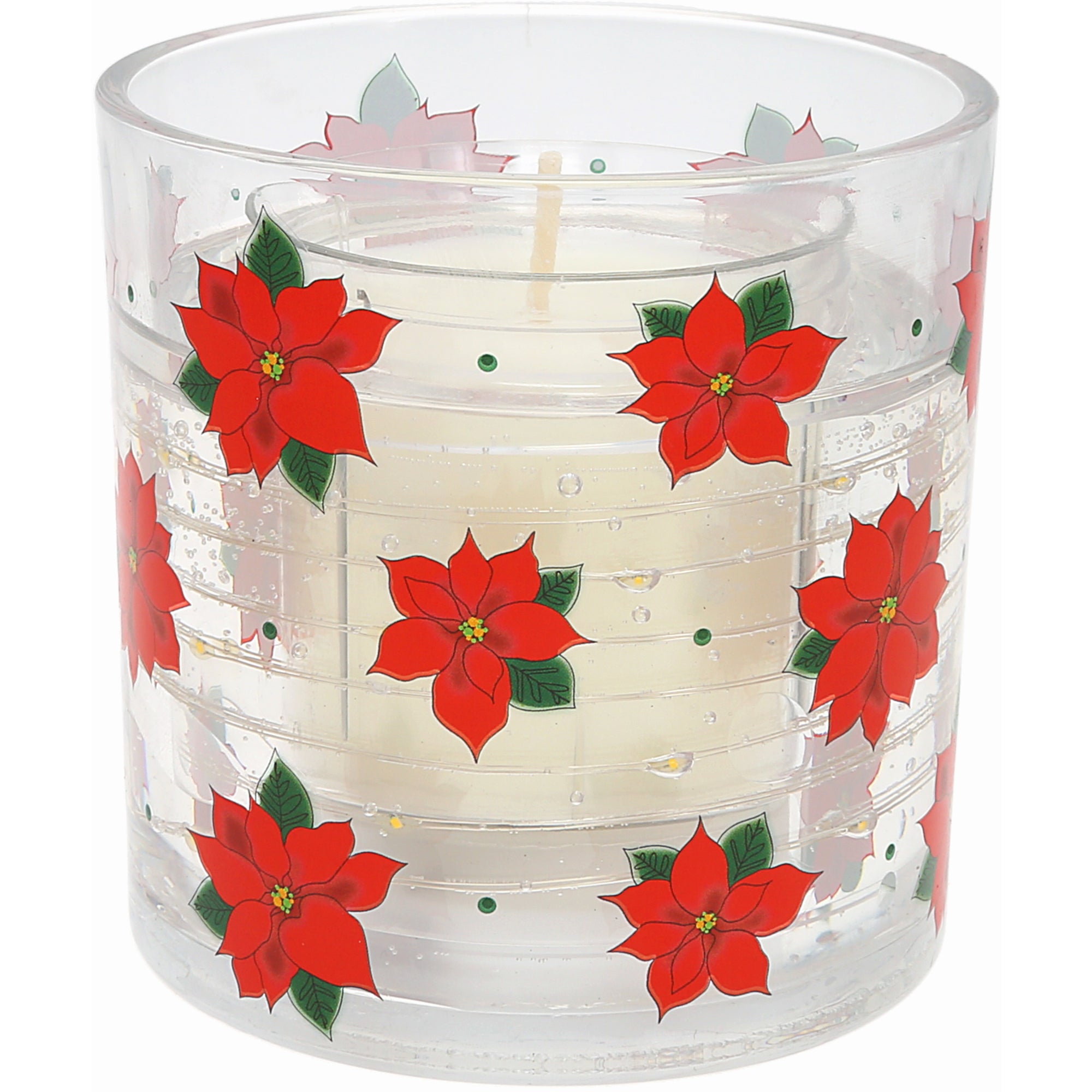 - PREMIUM QUALITY: This unscented 3.5 oz candle includes soy wax, heat-activated LEDs, and a clear gel layer that enhances illumination. The glass vessel is wrapped in beautifully printed poinsettias and greenery. No glitter included, making it ideal for classic, elegant décor. Packaged with a printed band and white die-cut box.