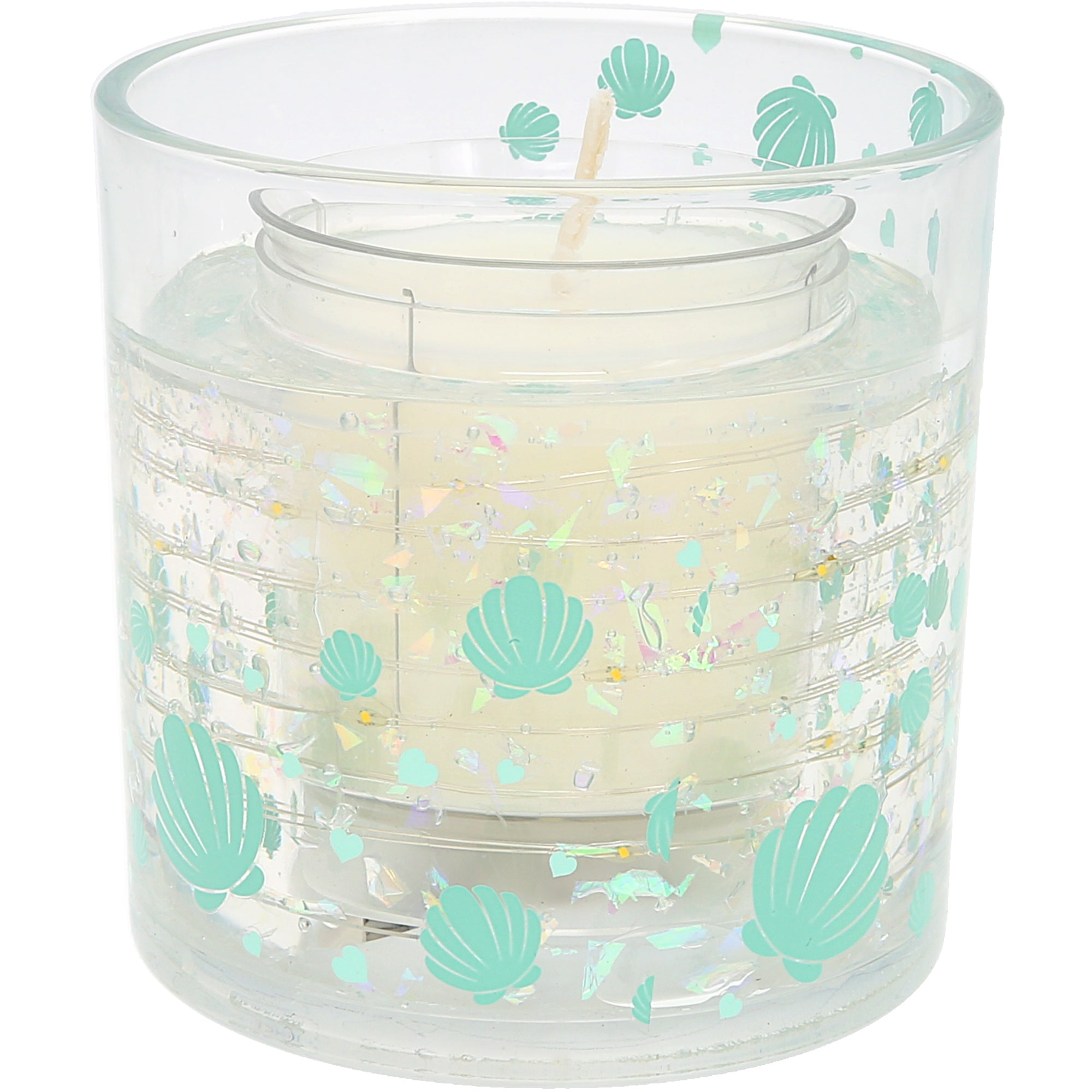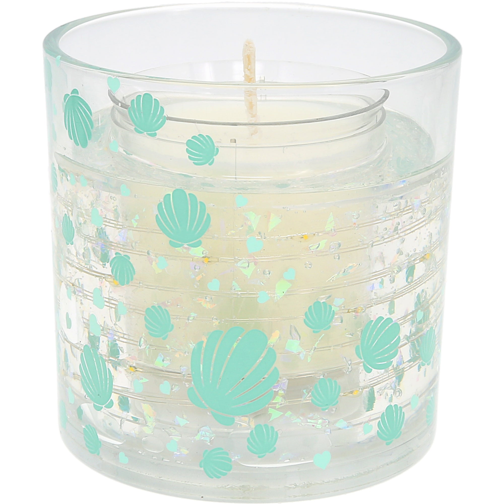 - PREMIUM QUALITY: This 3.5 oz candle includes unscented soy wax paired with LED lights suspended in gel that softly illuminate when warmed. The high-clarity glass showcases blue-green seashells and coastal botanical artwork. No glitter is included, keeping the look fresh and minimal.