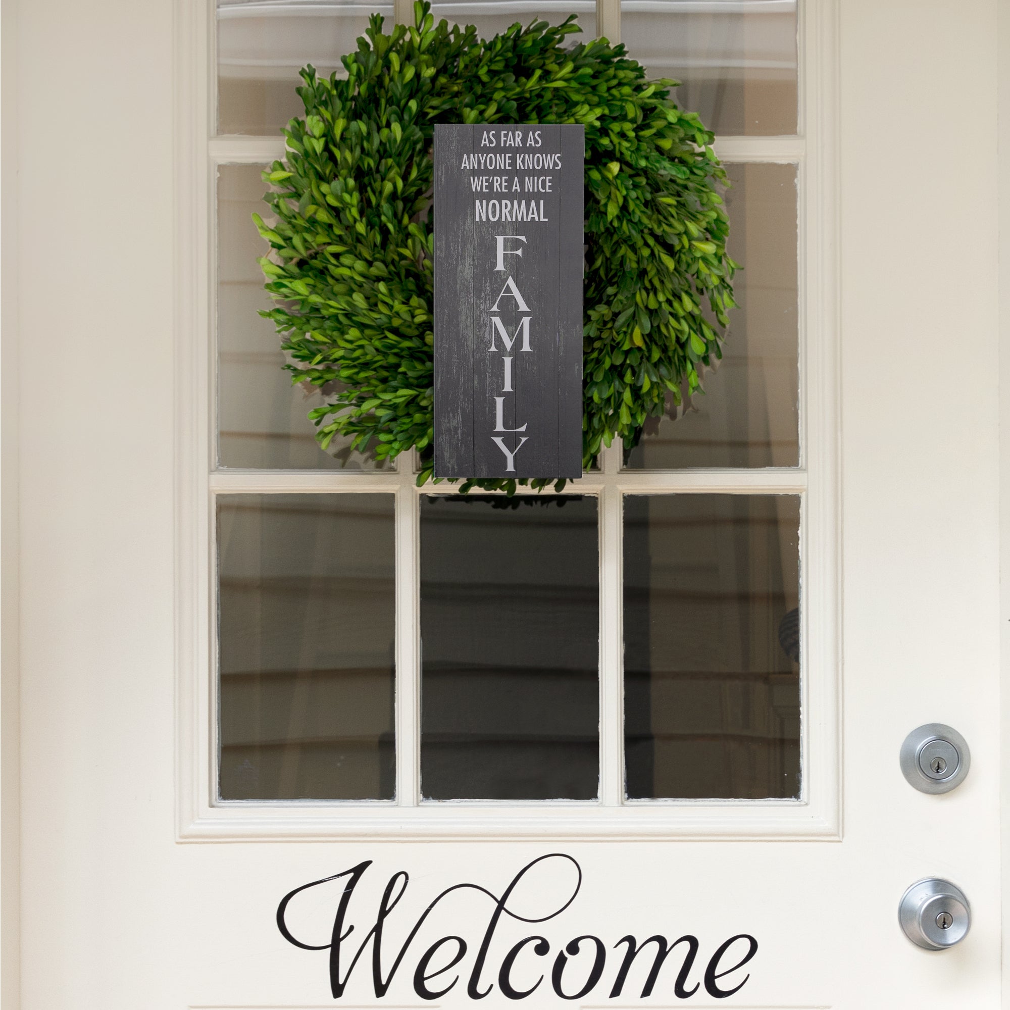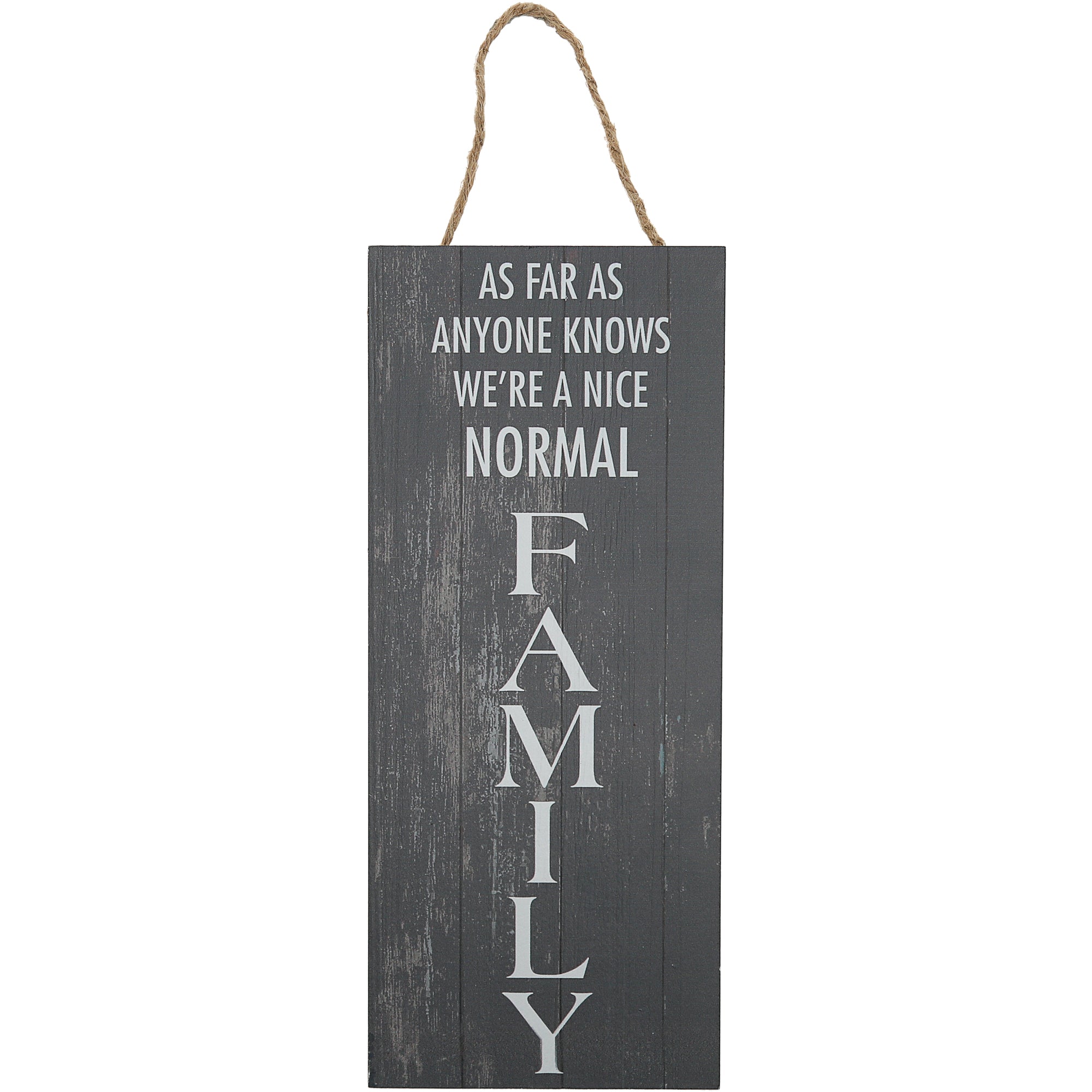 - IN-HOUSE DESIGN: The dark gray rustic-finished textured four-section boarded front has a glossy white "As Far As Anyone Knows We're A Nice Normal Family" sentiment decal. The flat-backing has a natural pine finish.