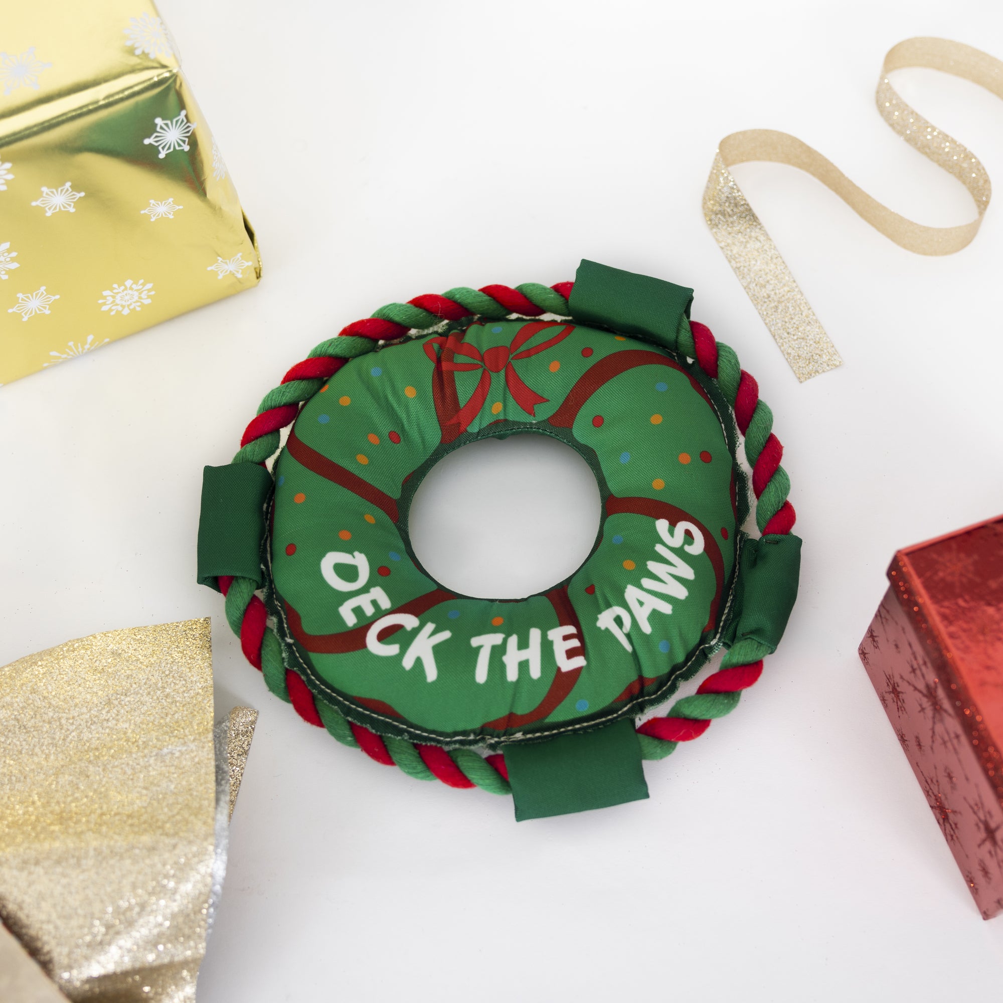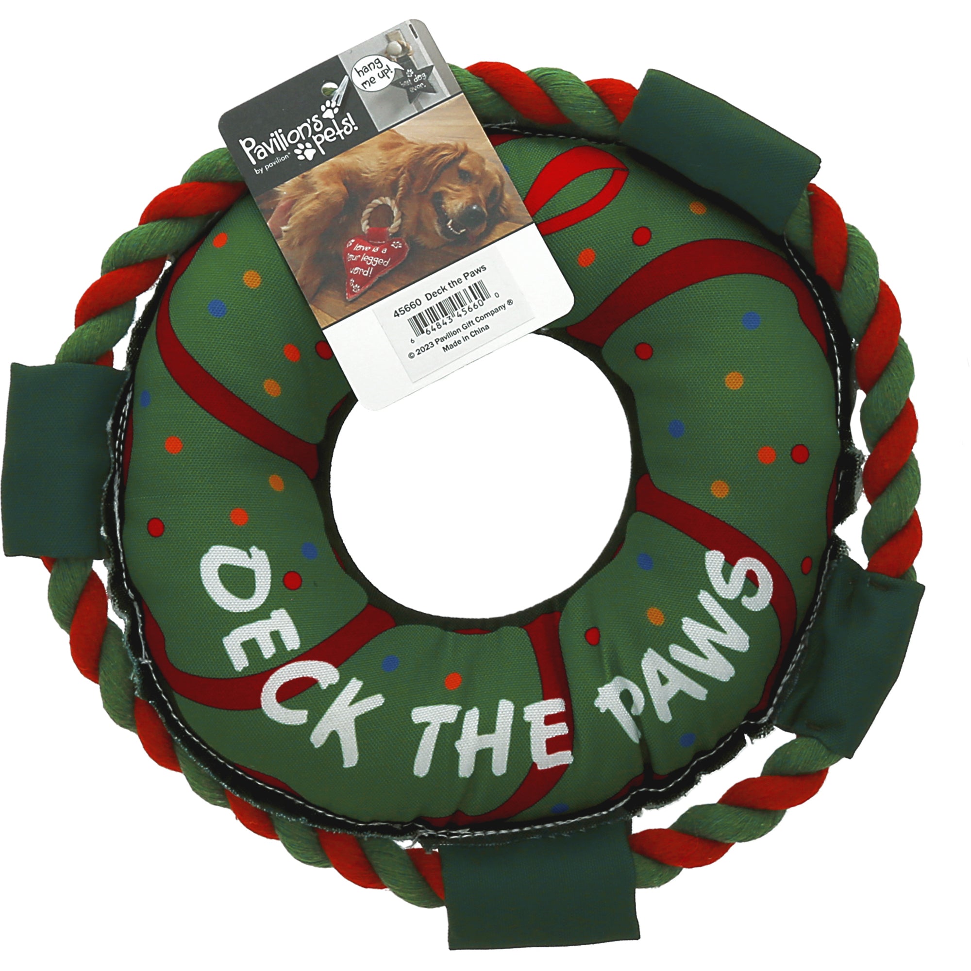 - IN-HOUSE DESIGN: The wreath is decorated with rainbow holiday lights, a red bowtie, and ribbon wrap. The bottom half of the toy features a white sentiment: "Deck The Paws." The plain back features a sew-in tag.