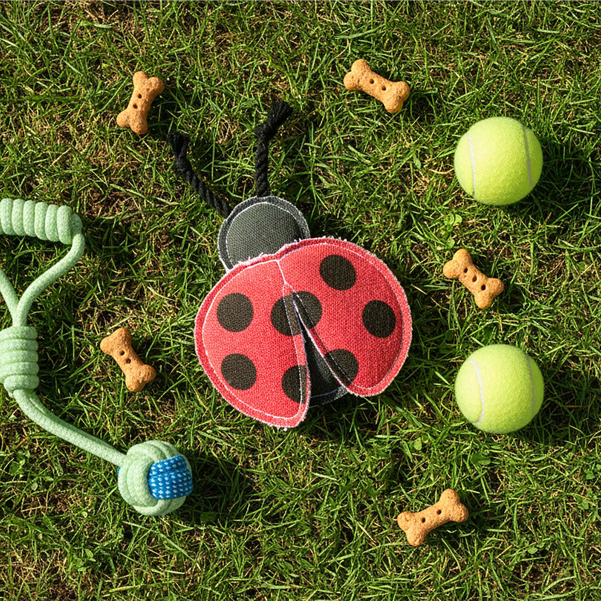 • IN-HOUSE DESIGN: Features a cheerful red-and-black ladybug design with the phrase “Lucky Dog” printed on the back. The thick rope accents add texture and extra grip for dogs who love to fetch, tug, and chew.