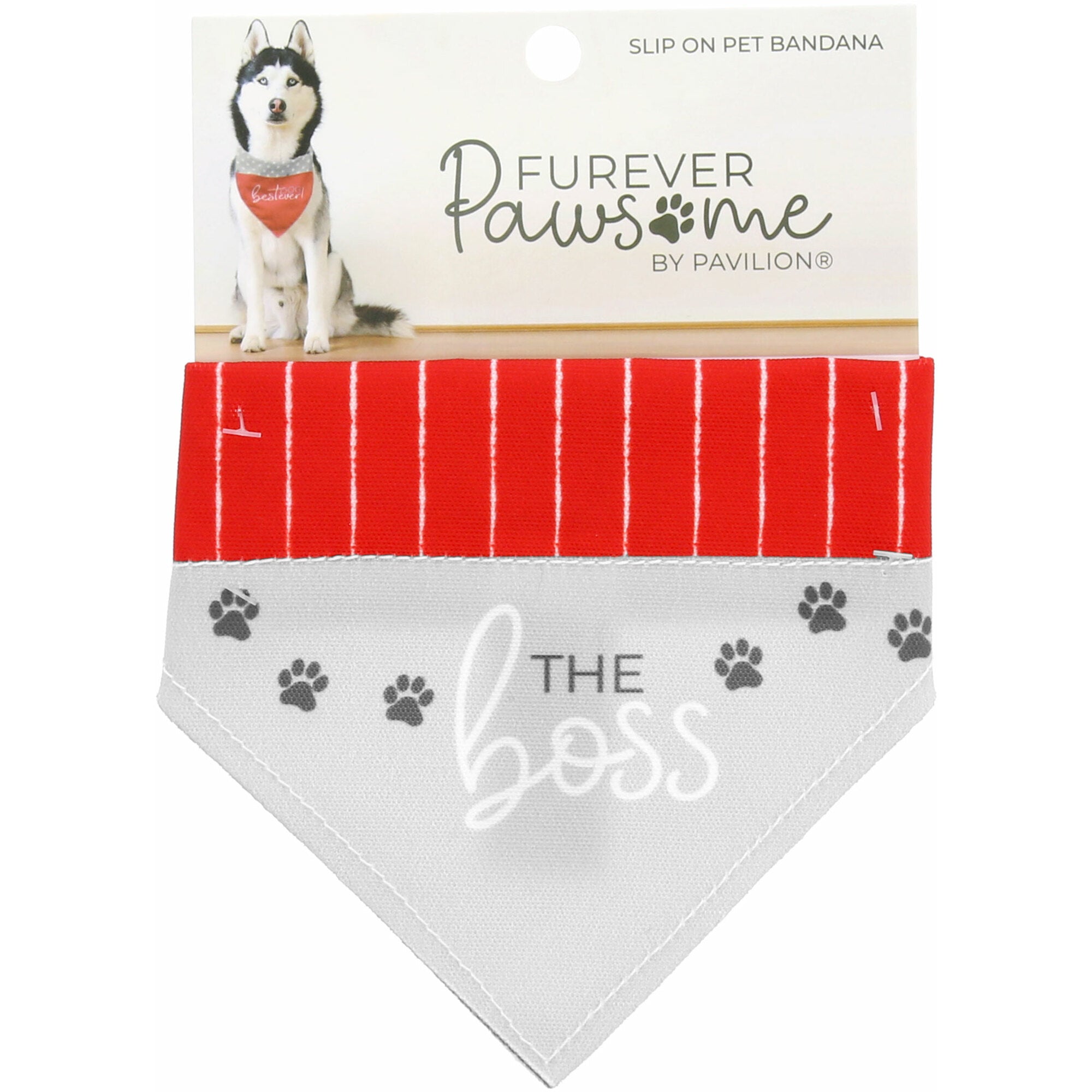 - IN-HOUSE DESIGN: The red background features a white vertical striped design on the over-the-collar part. The bottom gray section has a "The Boss" white and gray sentiment with a pawprint pattern. The backside has a sewn-in logo tag on the striped section and a soft touch finish for comfort finish on the bottom triangle part.