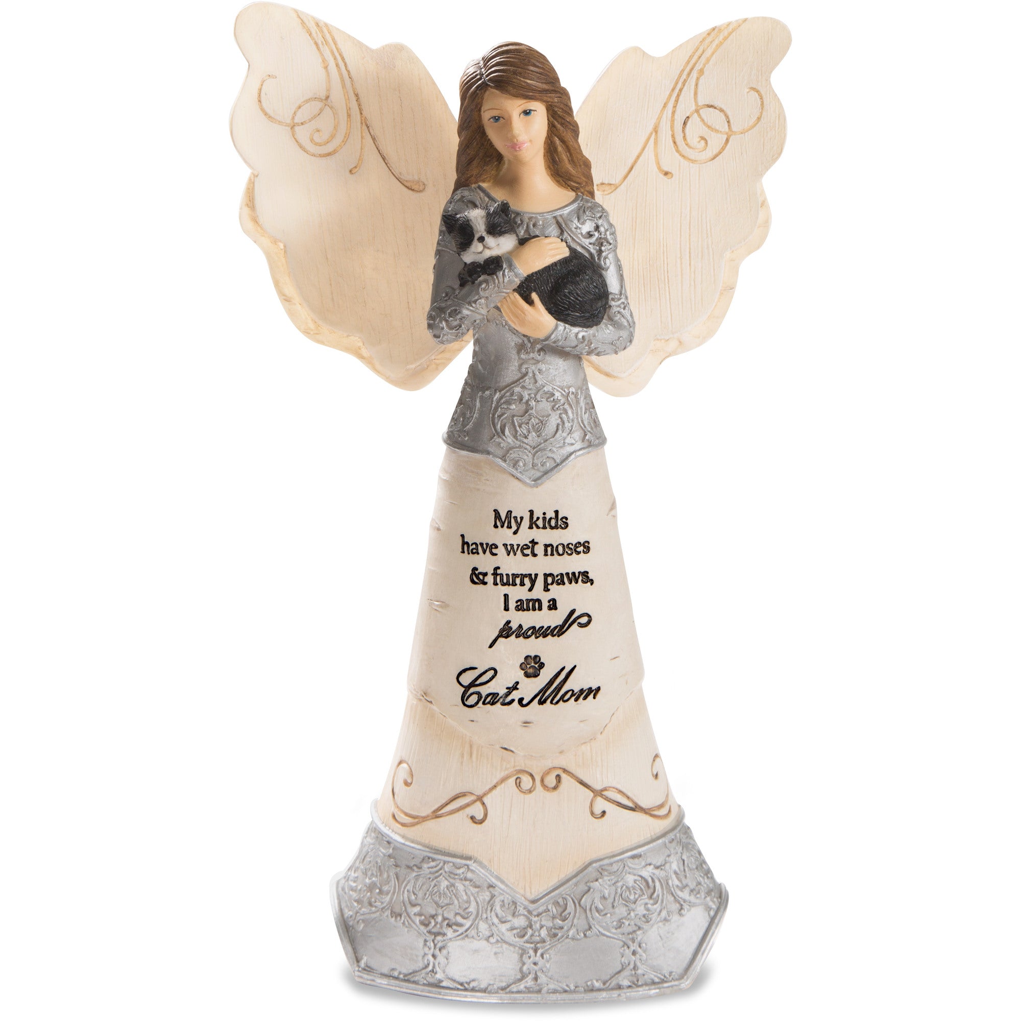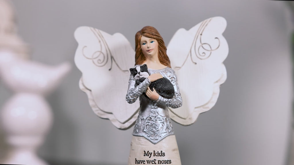 - IN-HOUSE DESIGN: "My Kids Have Wet Noses & Furry Paws; I Am A Proud Cat Mom" text is debossed and painted onto the front of the angel, alongside an intricate silver design and cat. The foam pads on the bottom to prevent surfaces from being scratched.