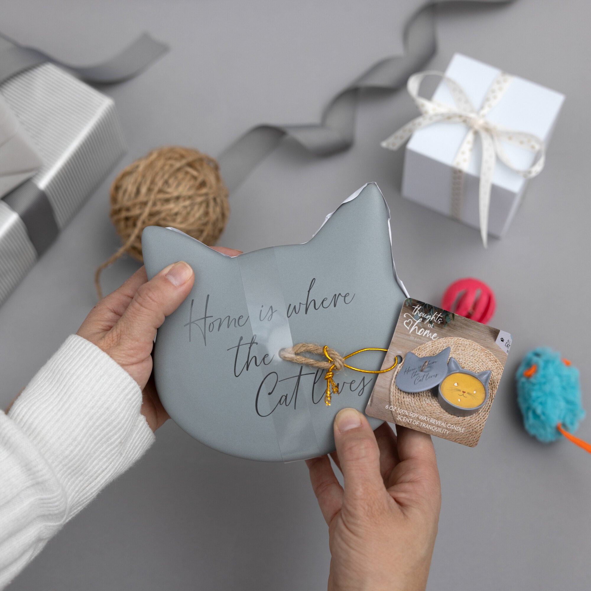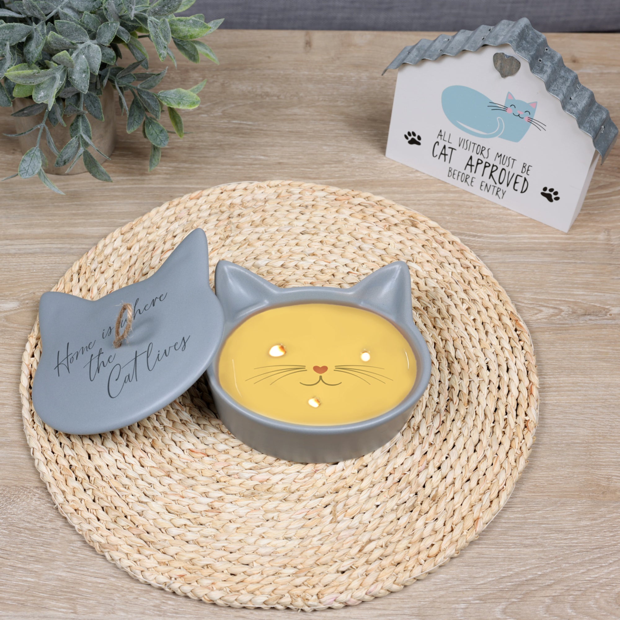 - IN-HOUSE DESIGN: Introducing our innovative candle that brings a delightful surprise to your loved one as time goes by. After approximately 10 minutes, a cat's nose, whiskers, and mouth emerge from the wax, capturing your attention with their playful design. As the candle burns, the pattern gradually reveals itself after 60 to 80 minutes, creating a captivating visual experience. With each subsequent burn, the design disappears and reappears, adding an element of excitement to every lighting. The candle's lid bears a gray "Home Is Where The Cat Lives" sentiment and a jute rope handle.