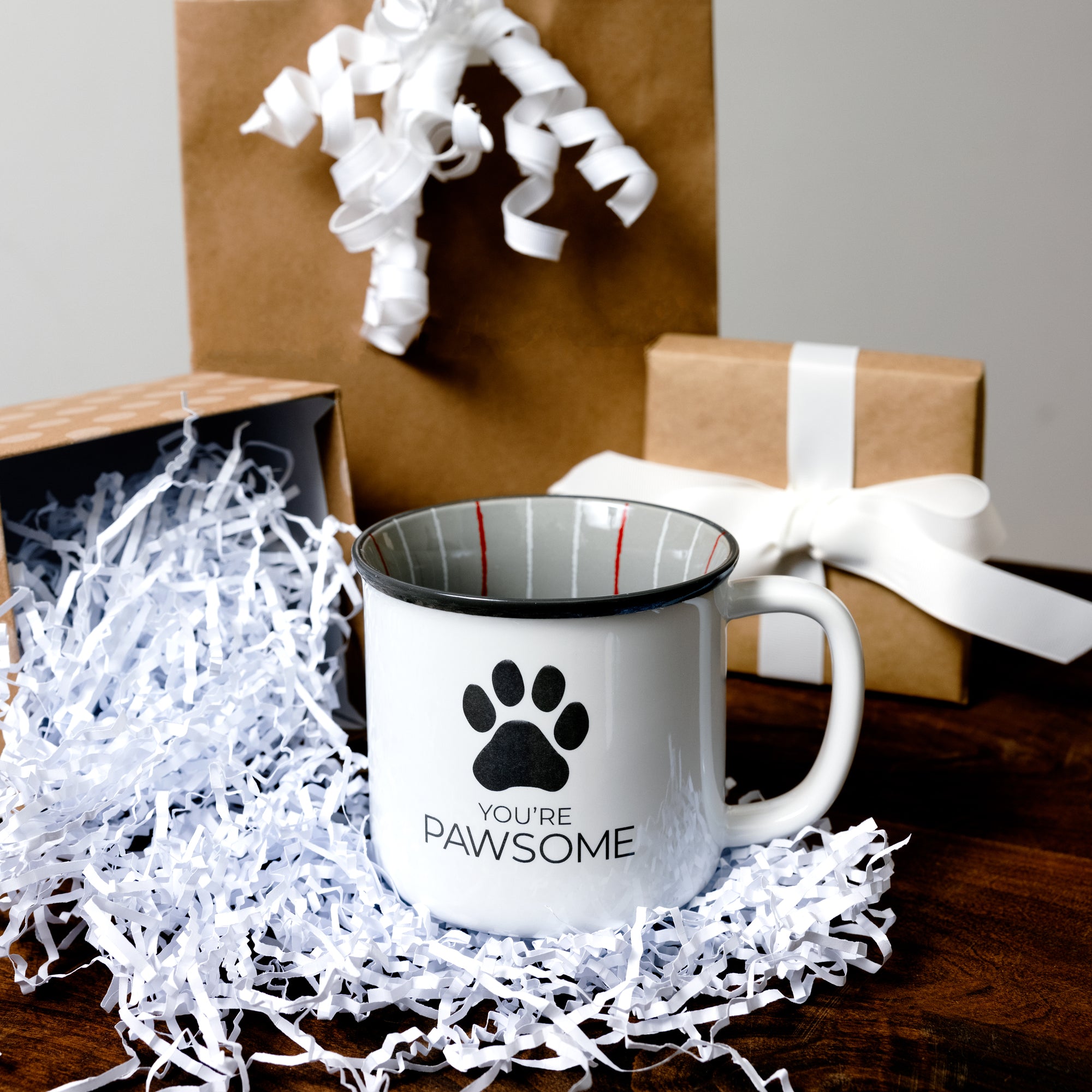• IN-HOUSE DESIGN: The mug's front features a paw print silhouette. Right below is a sentiment: "You're Pawesome." The lip of the white cup is dark gray, whereas the interior is gray and has a crayon-looking white & red striped pattern interior wrap-around finish.