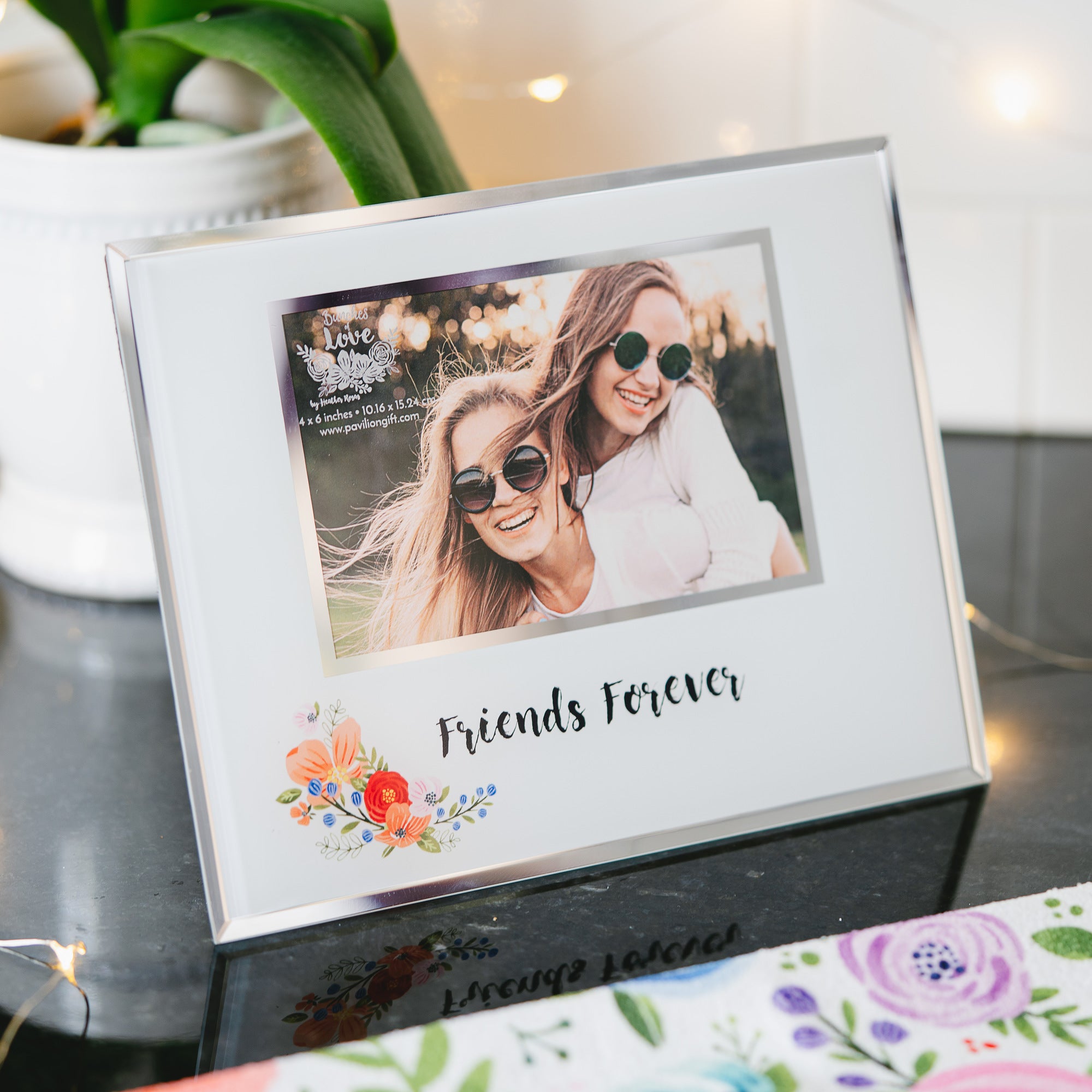 - IN-HOUSE DESIGN: "Friends Forever" text and accompanying floral design are printed around the replaceable photo.