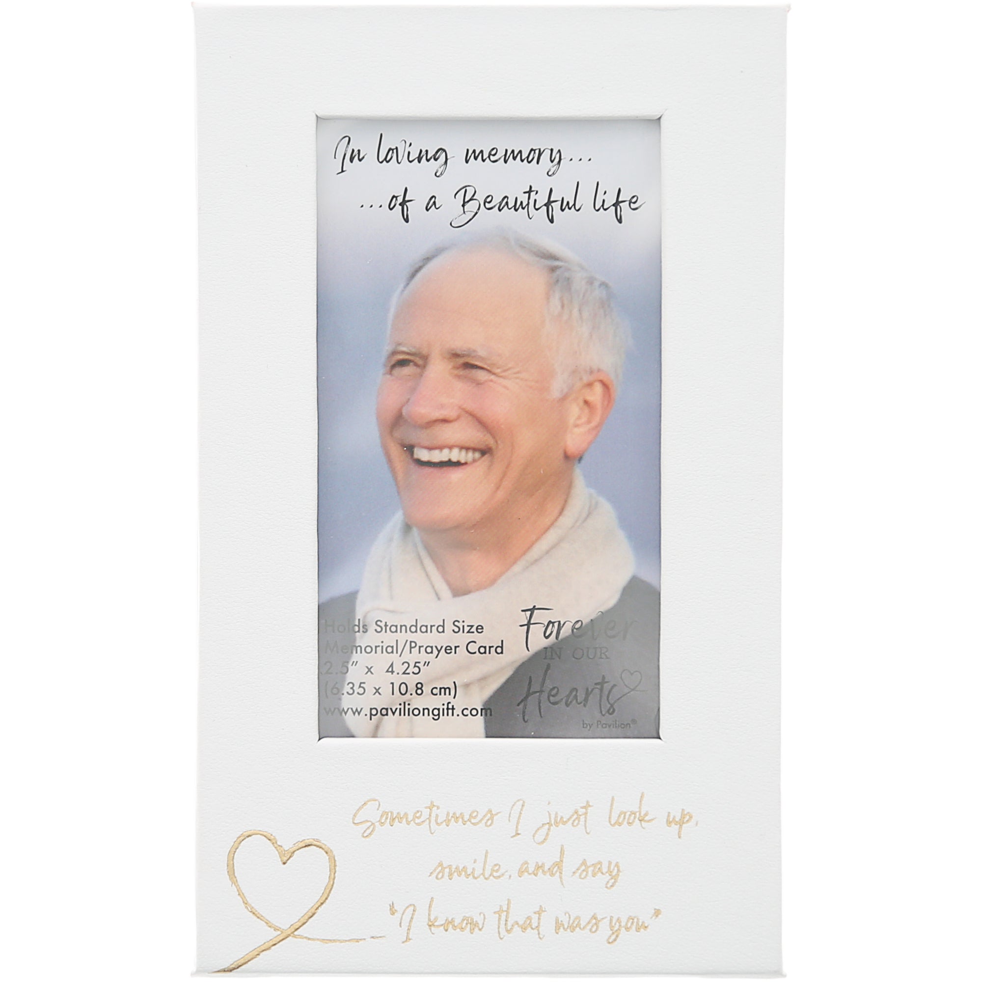 - IN-HOUSE DESIGN: The front side of the frame has a debossed gold heart pattern design and a heartfelt sentiment, "Sometimes I Just Look Up, Smile, And Say 'I Know That Was You.'" beneath the photograph holder.