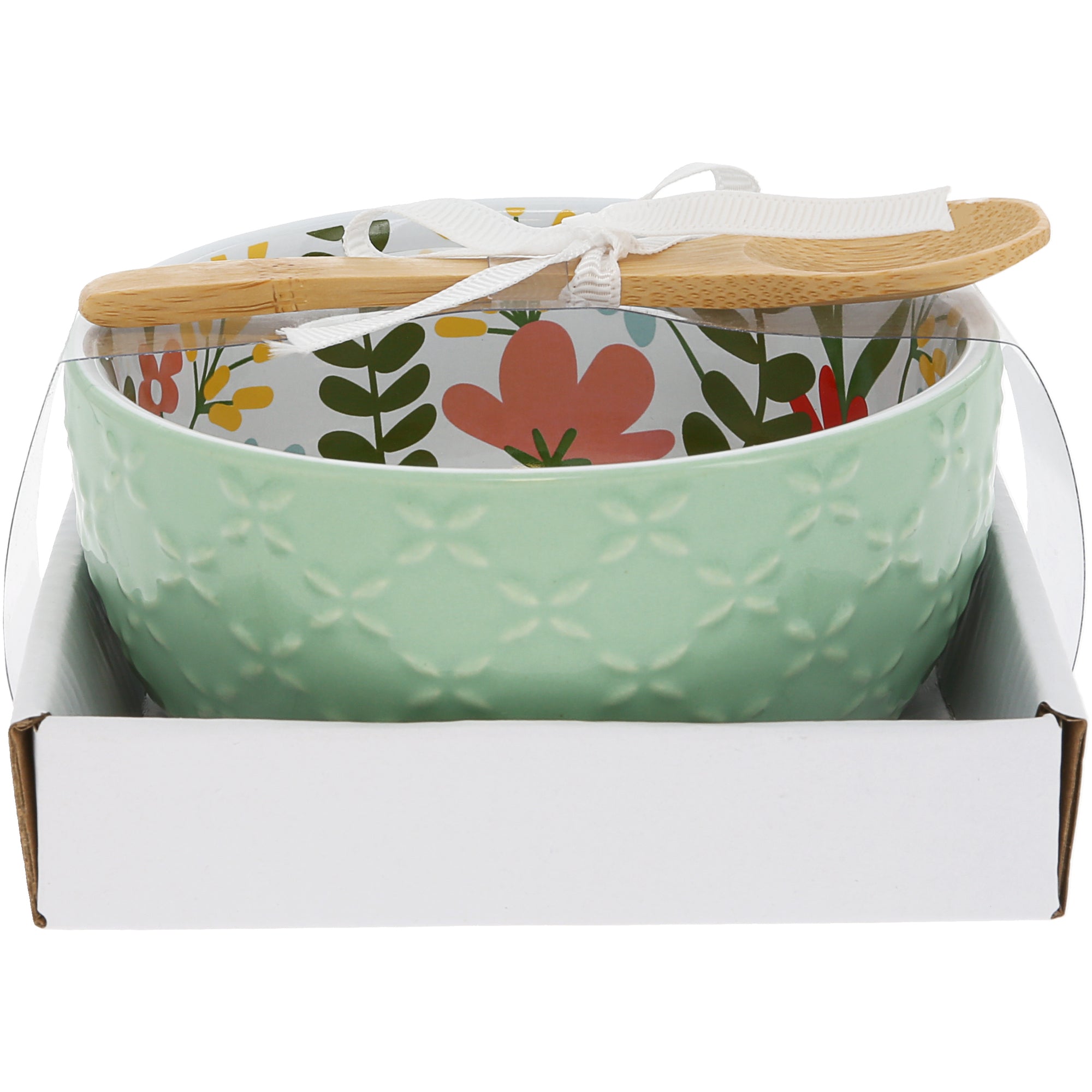 - IN-HOUSE DESIGN: The "Friends" bowl has a stunning glossy colored glaze exterior and an eye-catching floral design on the interior. This vibrant floral motif, adorned with pink, yellow, blue, and green flowers, is complemented by the heartwarming sentiment "Life is better with friends" printed along the interior rim. This combination of design and message adds a personal, thoughtful touch to every use. The bamboo spoon, with its natural finish, completes the set, creating a cozy and elegant aesthetic for any meal or snack shared among friends.