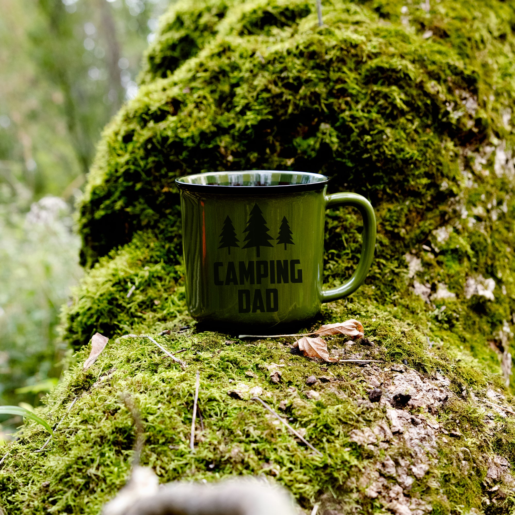 - IN-HOUSE DESIGN: The green coffee cup features an "Camping Dad" one-sided design accompanied by an interior plaid wrap-around pattern and a trio of pine trees decal.