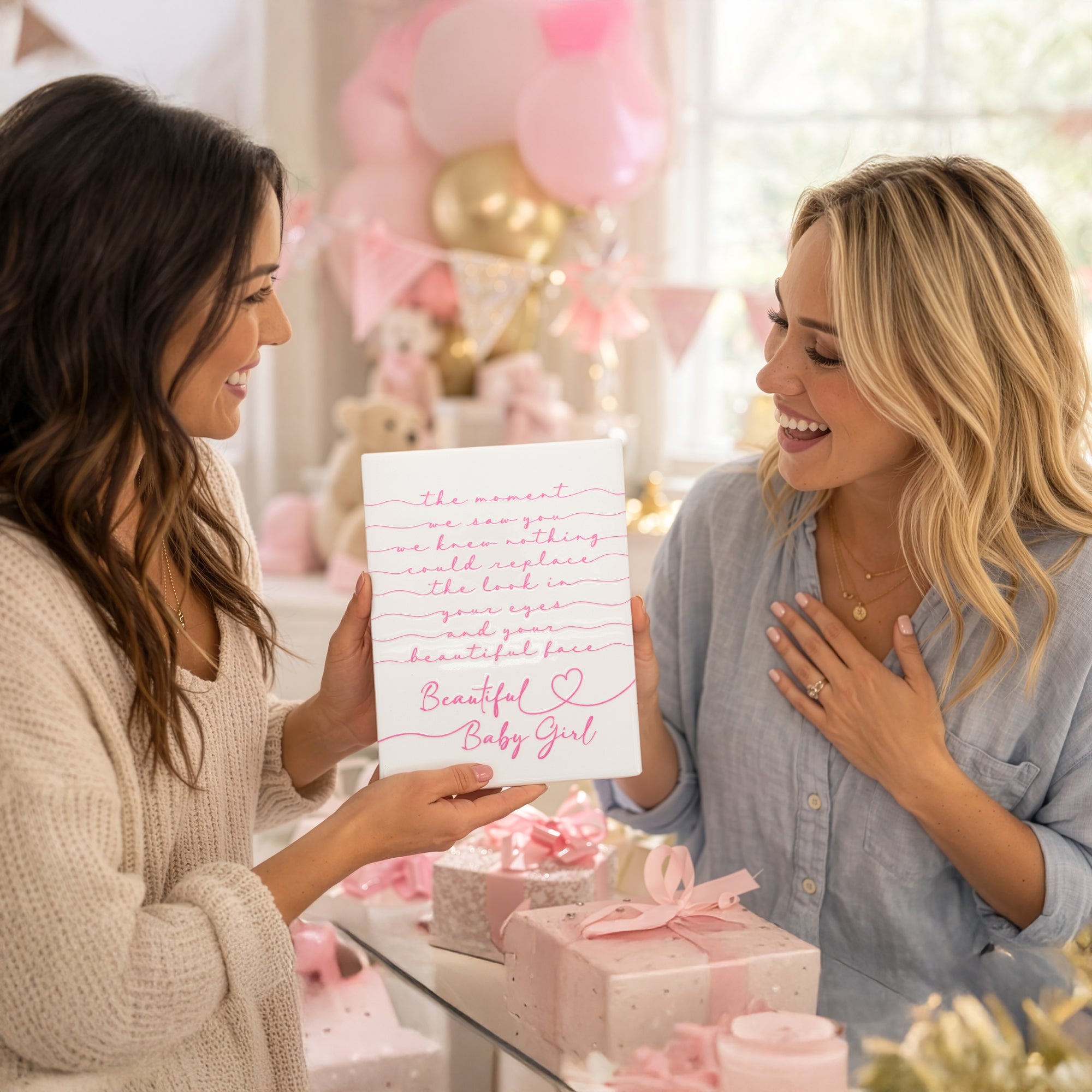 - PREMIUM QUALITY: This 6" x 8" easel-back ceramic plaque features a glossy white finish with raised and printed pink lettering. Made from durable ceramic with smooth rounded edges, it’s designed for tabletop display on dressers, shelves, or nursery accent tables. The heartfelt script reads, “The moment we saw you we knew nothing could replace the look in your eyes and your beautiful face – Beautiful Baby Girl.” Comes carefully packaged in a protective white die-cut box, making it gift-ready for new parents