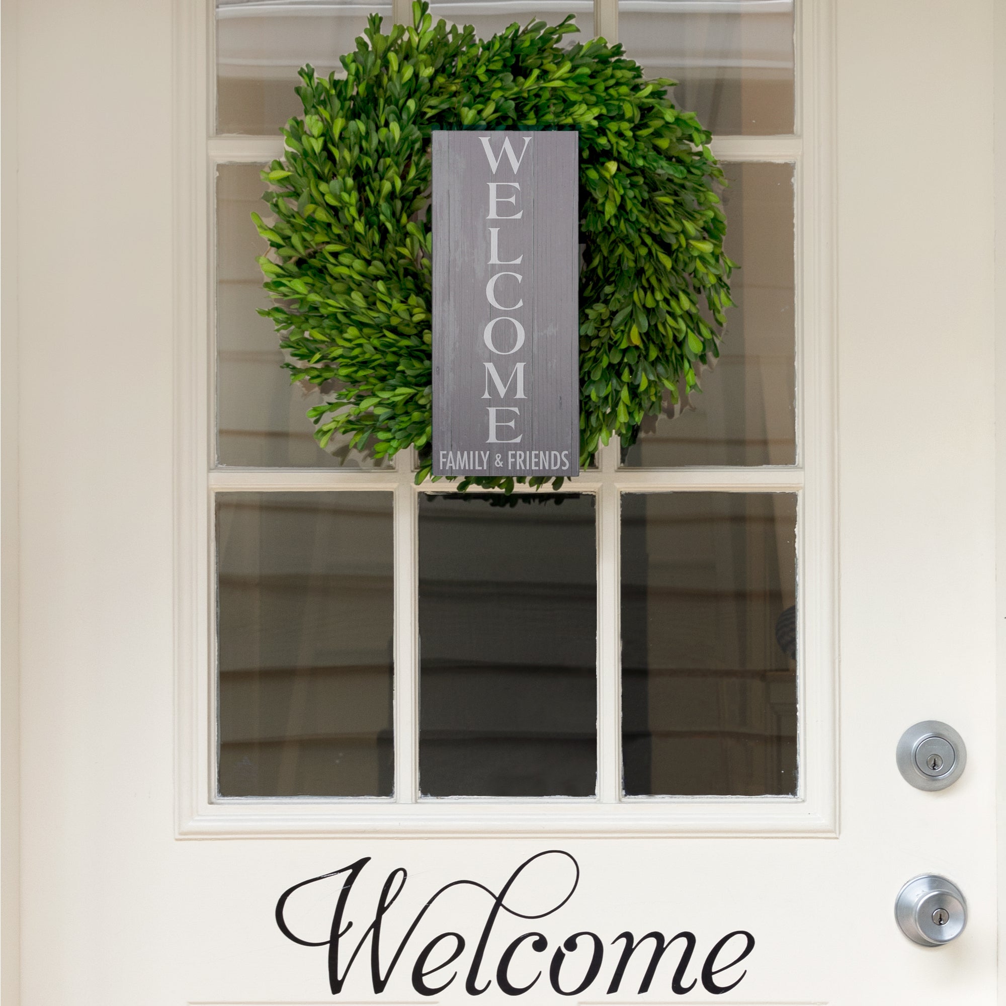 • IN-HOUSE DESIGN: The cool gray rustic-finished textured four-section boarded front has a glossy gray "Welcome Family & Friends" sentiment decal. The flat-backing has a natural pine finish.