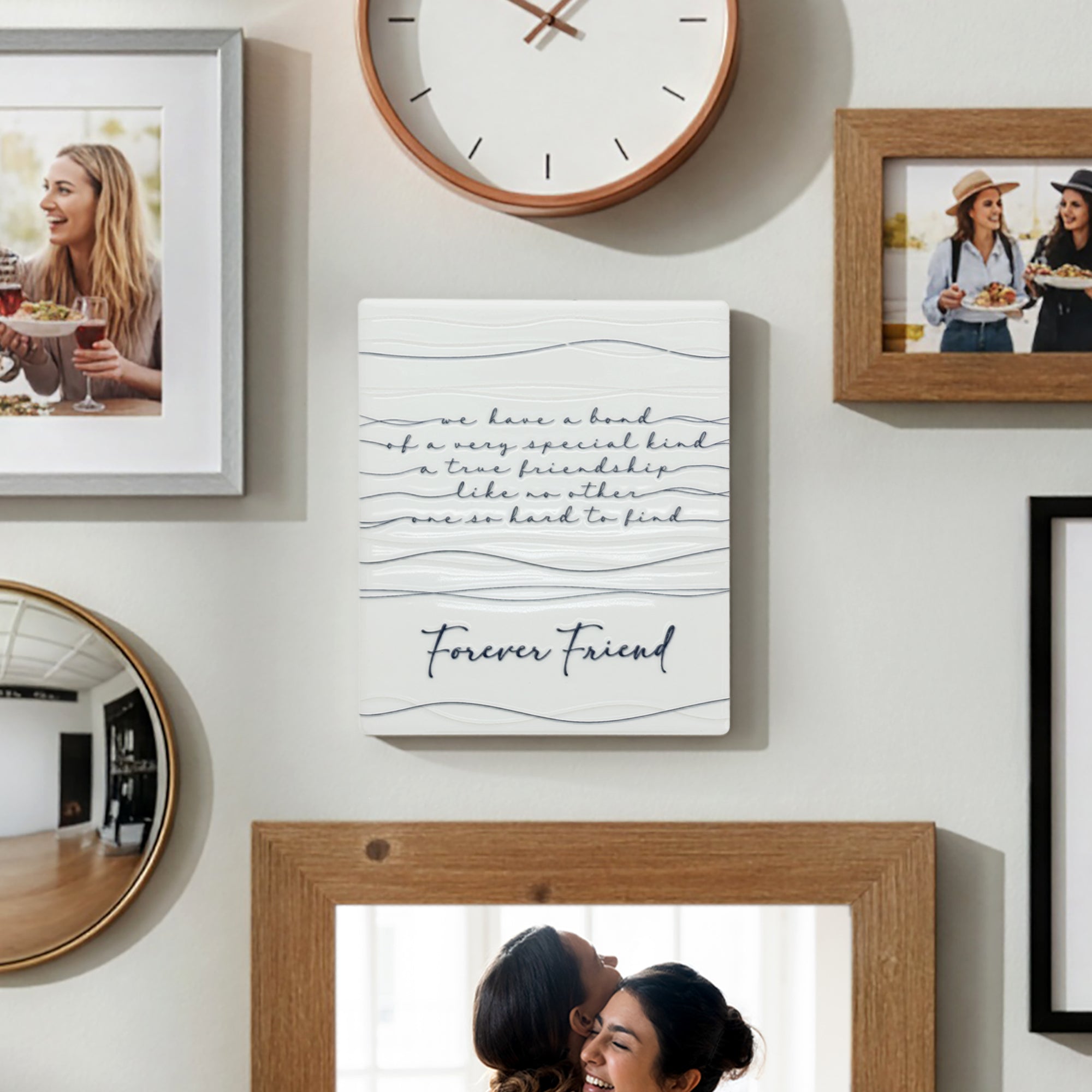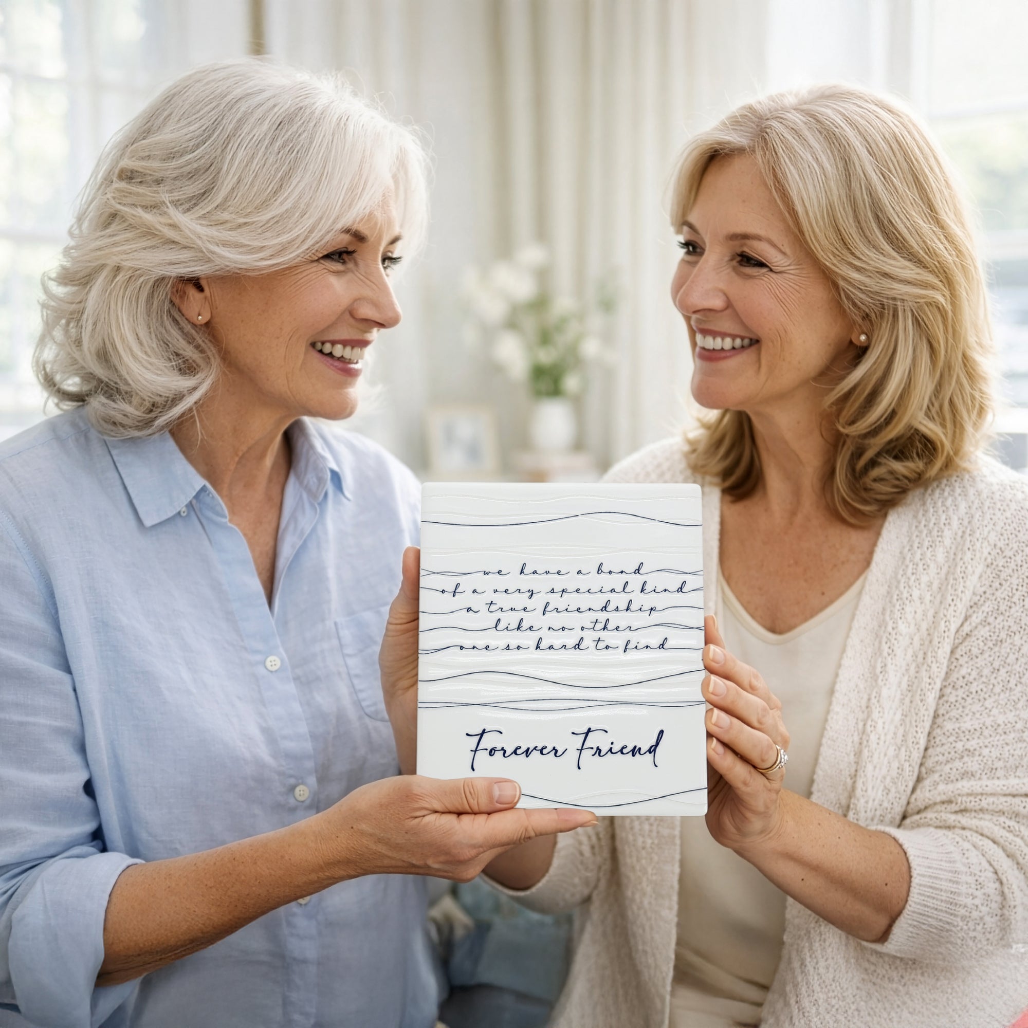 - IN-HOUSE DESIGN: The design features gentle navy linework that mimics flowing string, wrapping around the handwritten-style message: “We have a bond of a very special kind, a true friendship like no other, one so hard to find.” Below, the words “Forever Friend” are printed in deep blue raised lettering for contrast and emotional emphasis.