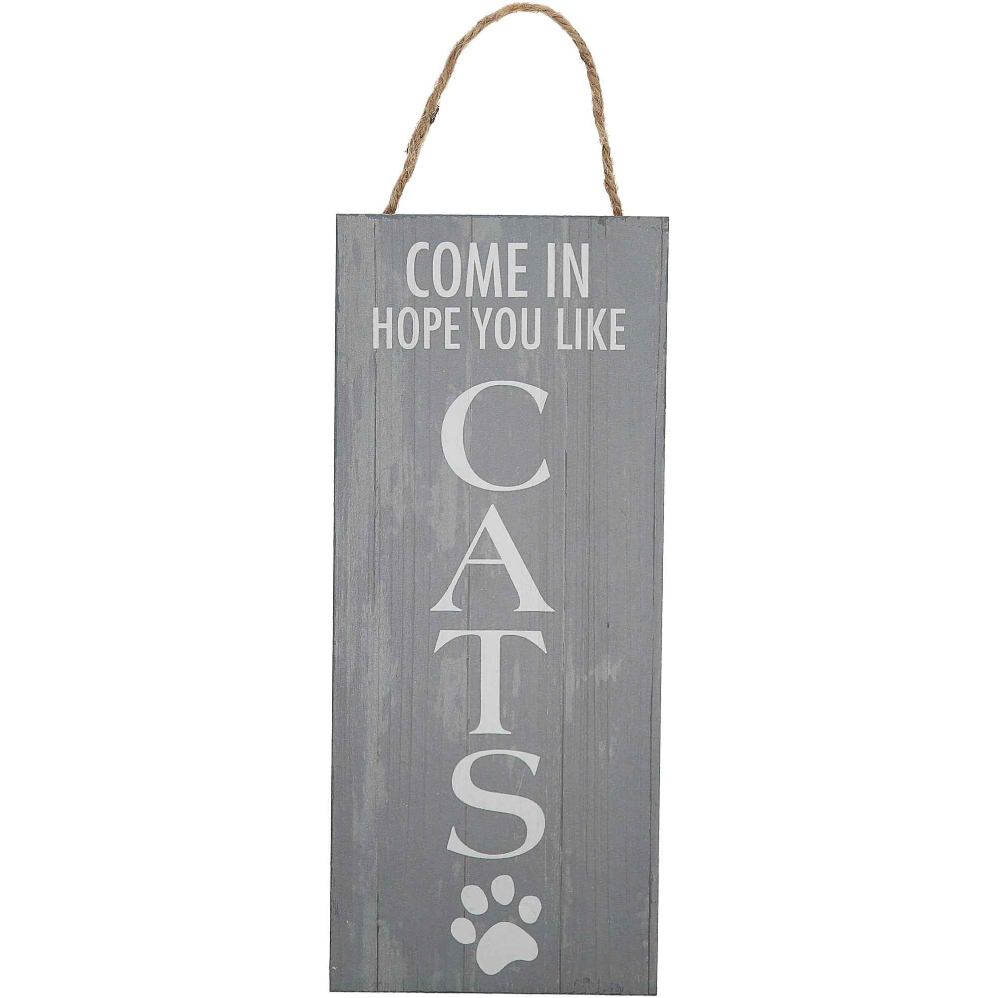 • IN-HOUSE DESIGN: The cool gray rustic-finished textured four-section boarded front has a glossy white "Come In Hope You Like Cats" sentiment decal and a pawprint. The flat-backing has a natural pine finish.