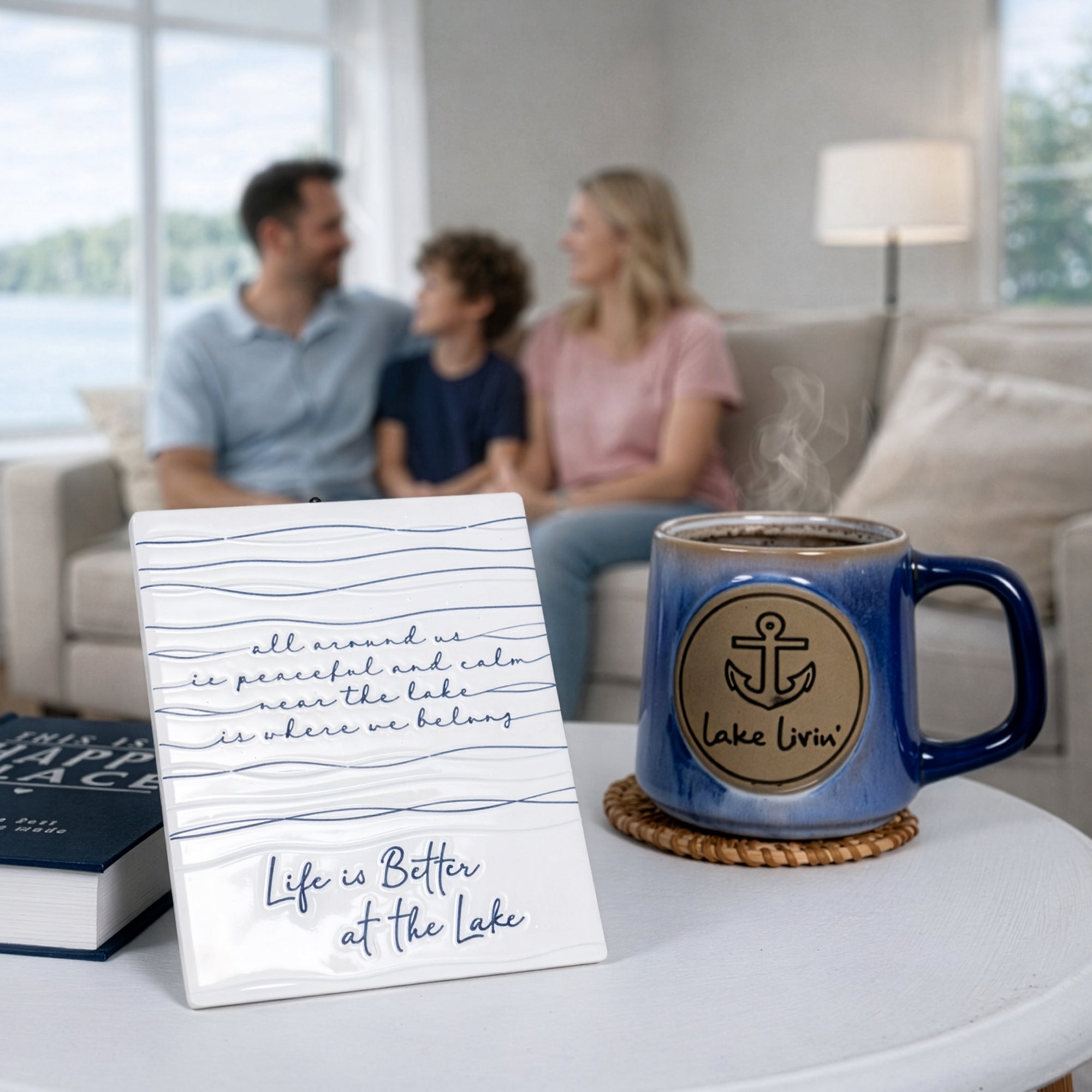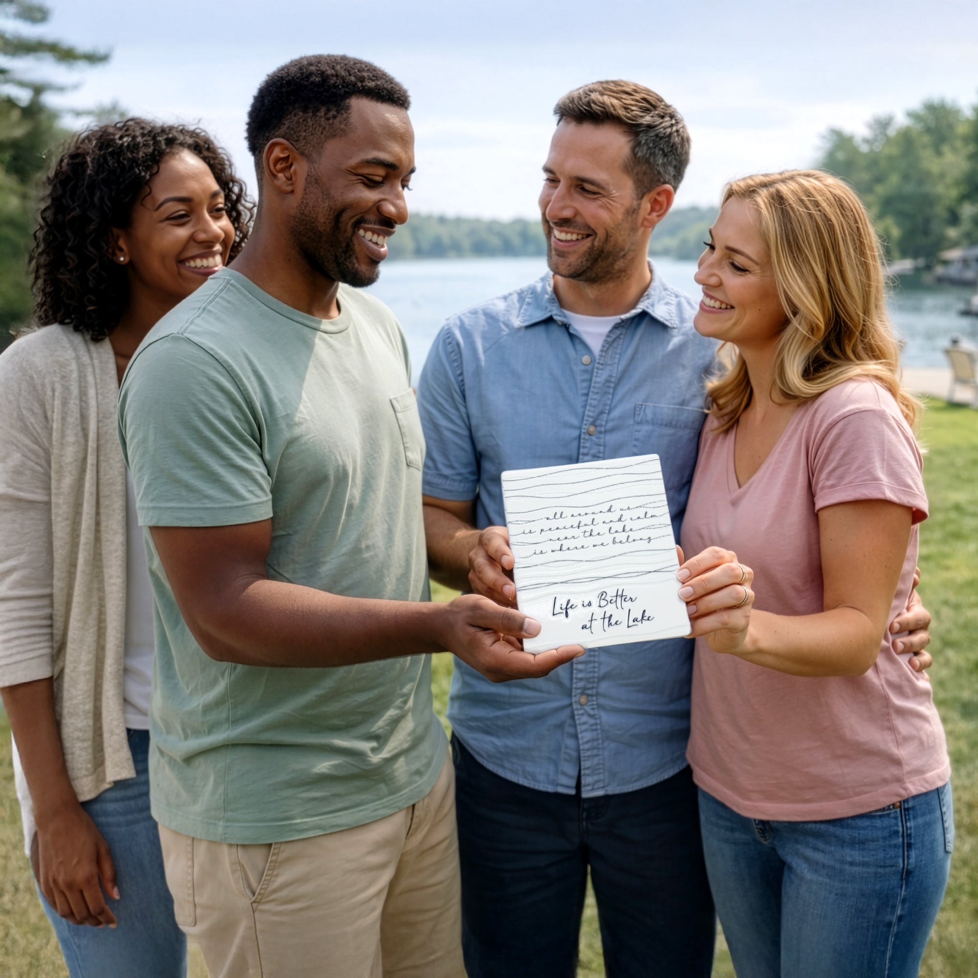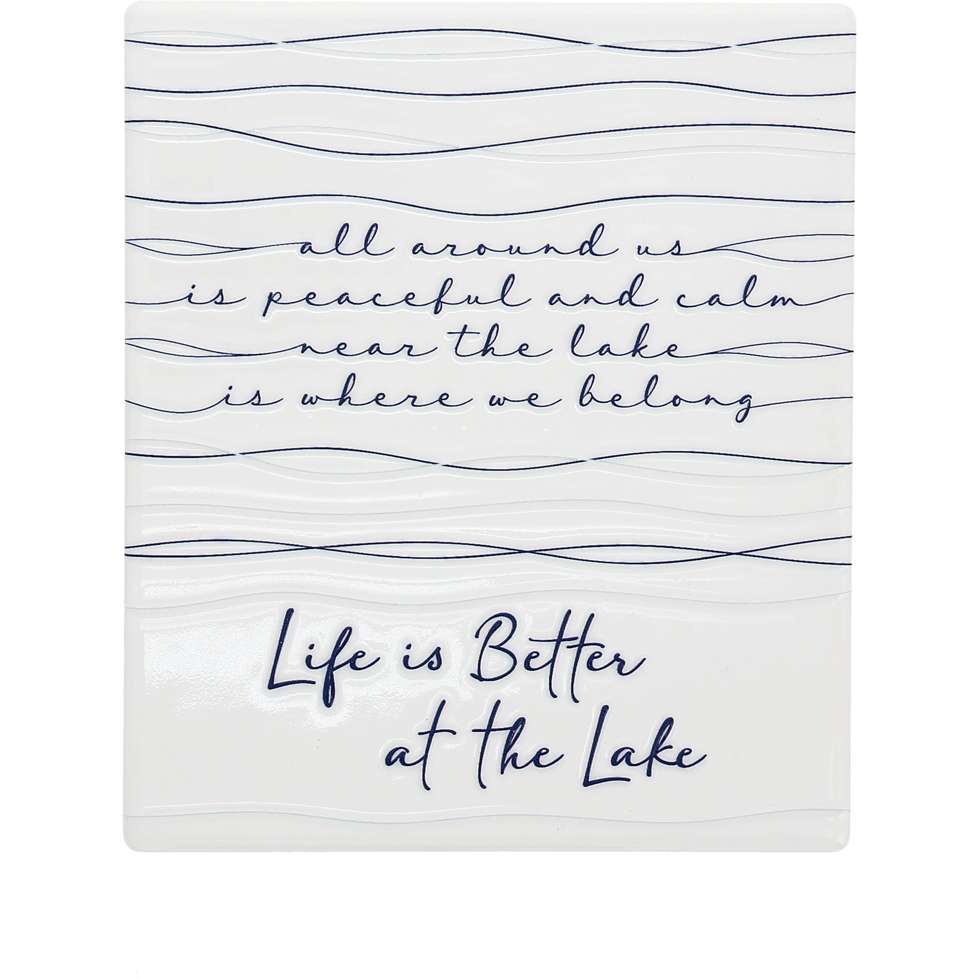 - IN-HOUSE DESIGN: The top half of the plaque features soft blue hand-drawn wave lines and the scripted message: “All around us is peaceful and calm, near the lake is where we belong.” Below, in large raised lettering, the sentiment “Life is Better at the Lake” is printed in deep lake blue. The layered linework gives the plaque dimension and calm coastal vibes.
