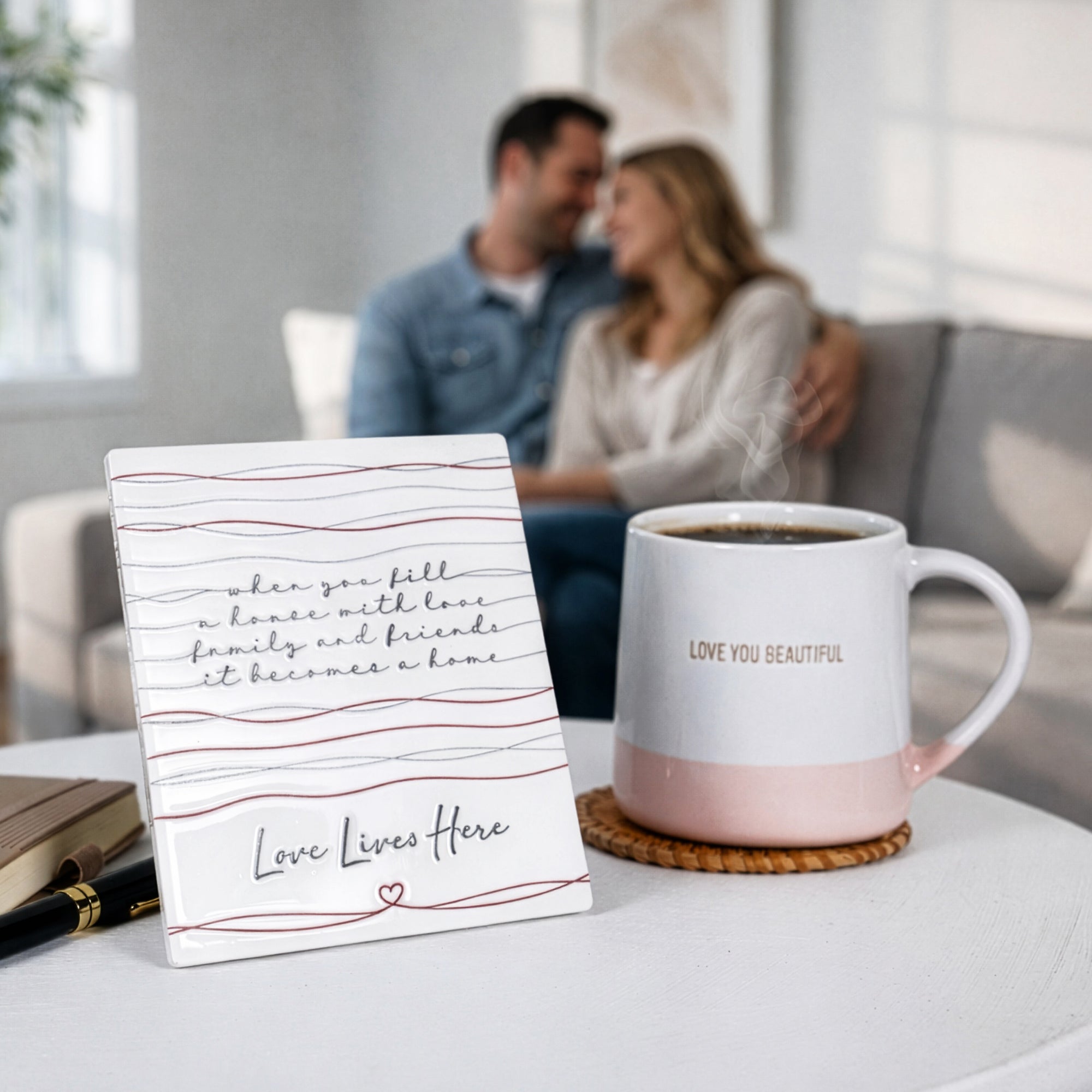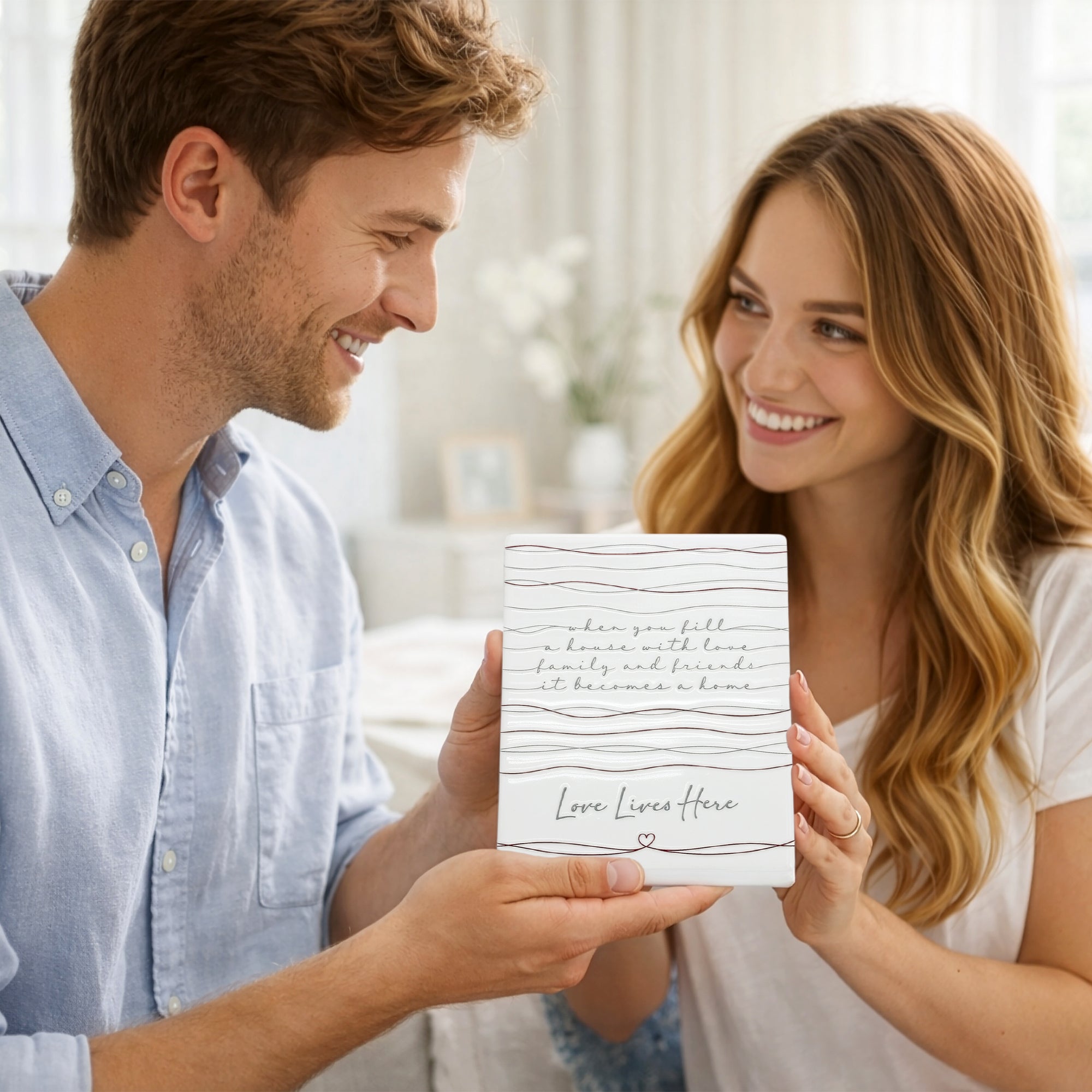 - IN-HOUSE DESIGN: Featuring thin maroon horizontal line art reminiscent of string or thread, the top portion displays the phrase “When you fill a house with love, family and friends, it becomes a home” in raised script lettering. The bottom sentiment “Love Lives Here” is printed in a soft gray cursive font, accompanied by a small heart icon beneath it.