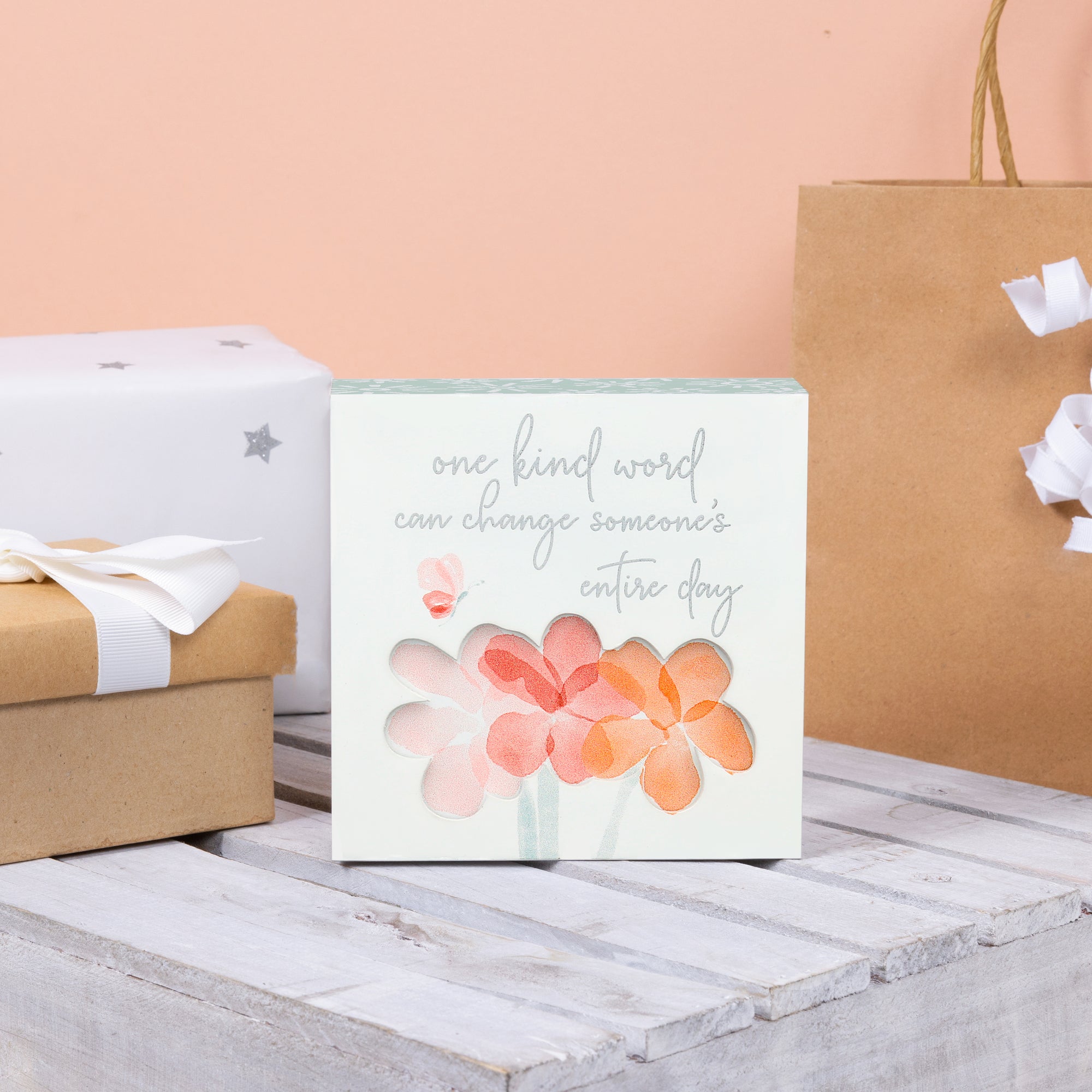 • IN-HOUSE DESIGN: “One Kind Word Can Change Someone’s Entire Day” text in silver and the accompanied pink and red butterfly is printed onto the front of the plaque. Large recessed flowers are centered in the middle of the plaque with a pink, red, and orange paint scheme. The back and edges of the plaque are a base of green paint with a fun flower pattern. This sturdy plaque will set nicely on a desk or window sill or can be hung up.