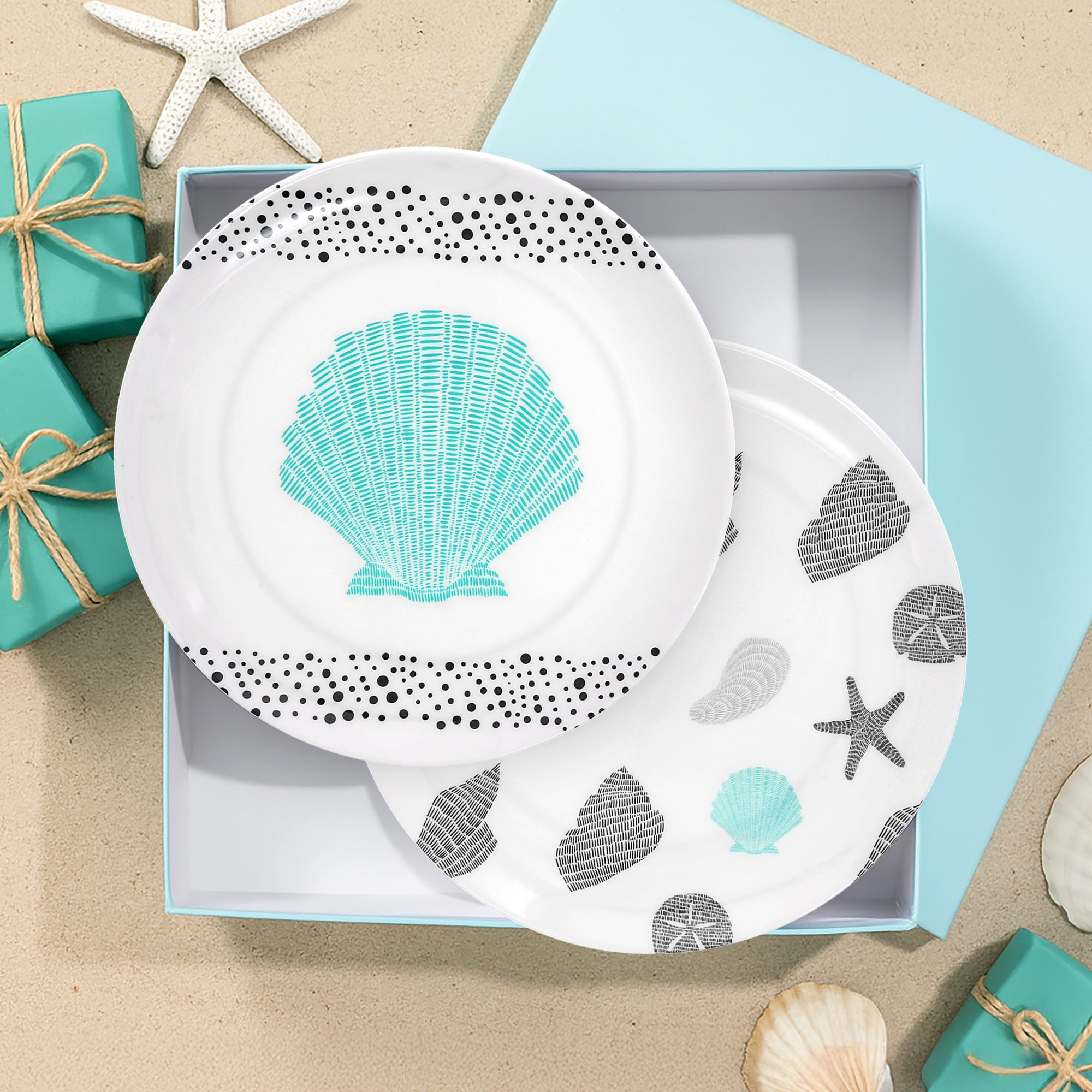- IN-HOUSE DESIGN: The Beach Melamine Appetizer Plates feature a delicate sea-life-inspired design, incorporating a mix of seashells, starfish, and coral in soft neutral and turquoise tones. This oceanic pattern is perfect for beach homes and coastal dining settings.