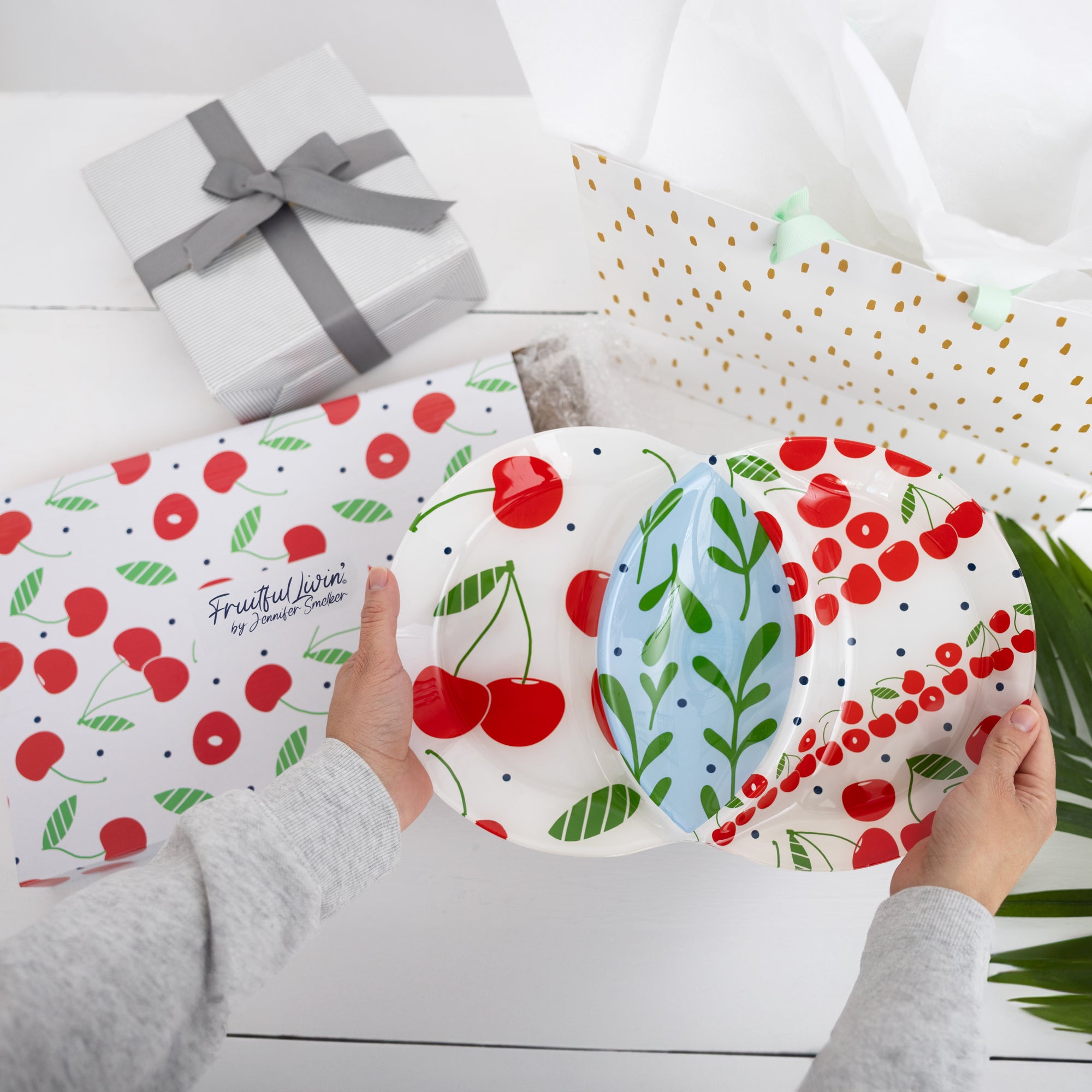 • IN-HOUSE DESIGN: The left section has some large cherries and blue polka dots above and below on a white background. The center section has a blue background with greenery leaves and blue polka dots. The right section has a combination of greenery, polka dots, and small/medium-sized cherries on a white background.