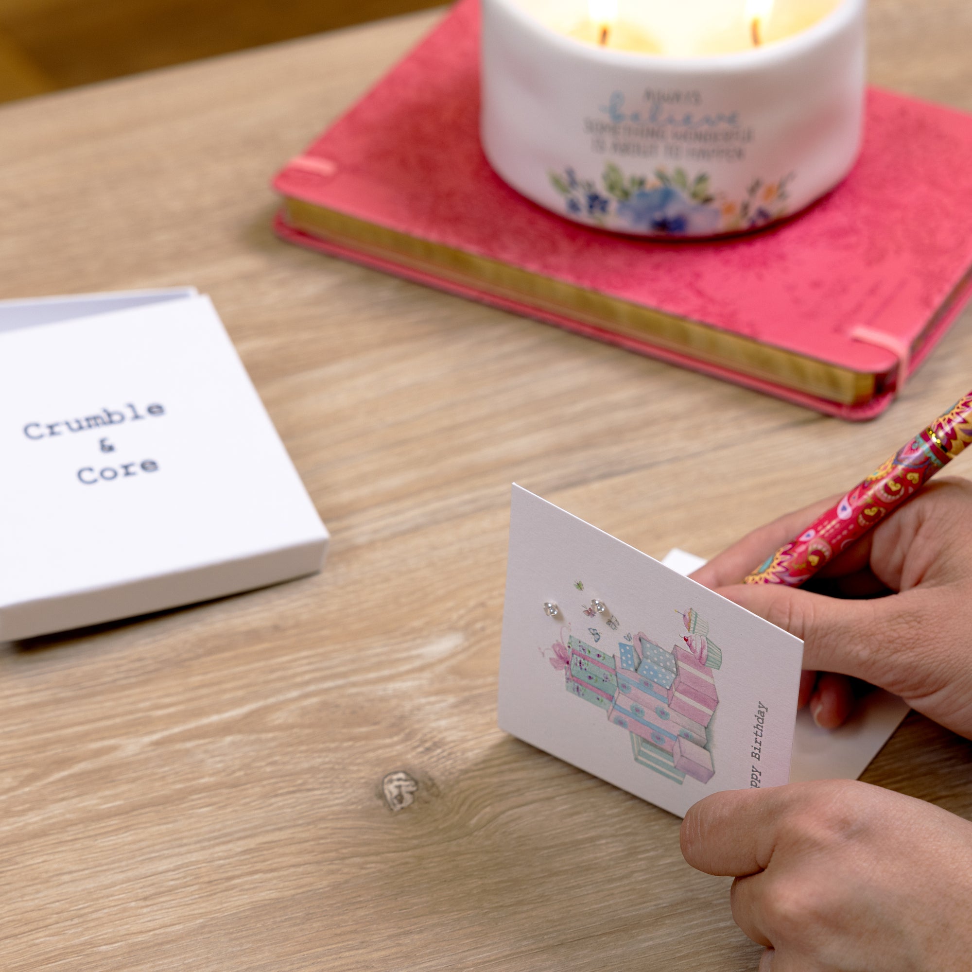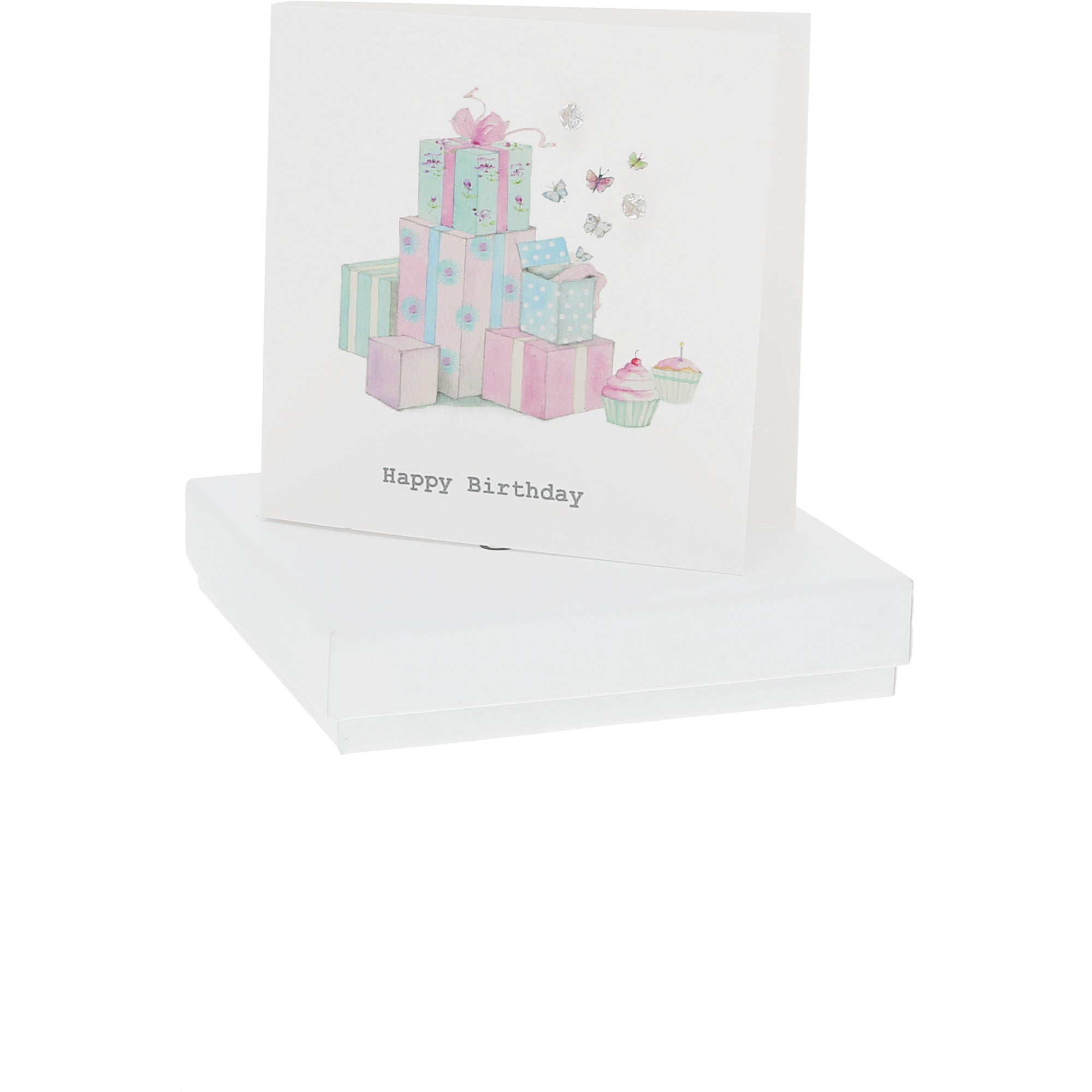 - IN-HOUSE DESIGN: The cheerful watercolored cupcakes, butterflies, and gift-wrapped presents dance around. The typewritten style gray "Happy Birthday" sentiment is placed below the celebratory printed design, whereas the earring is placed in the upper right-hand corner of the card.