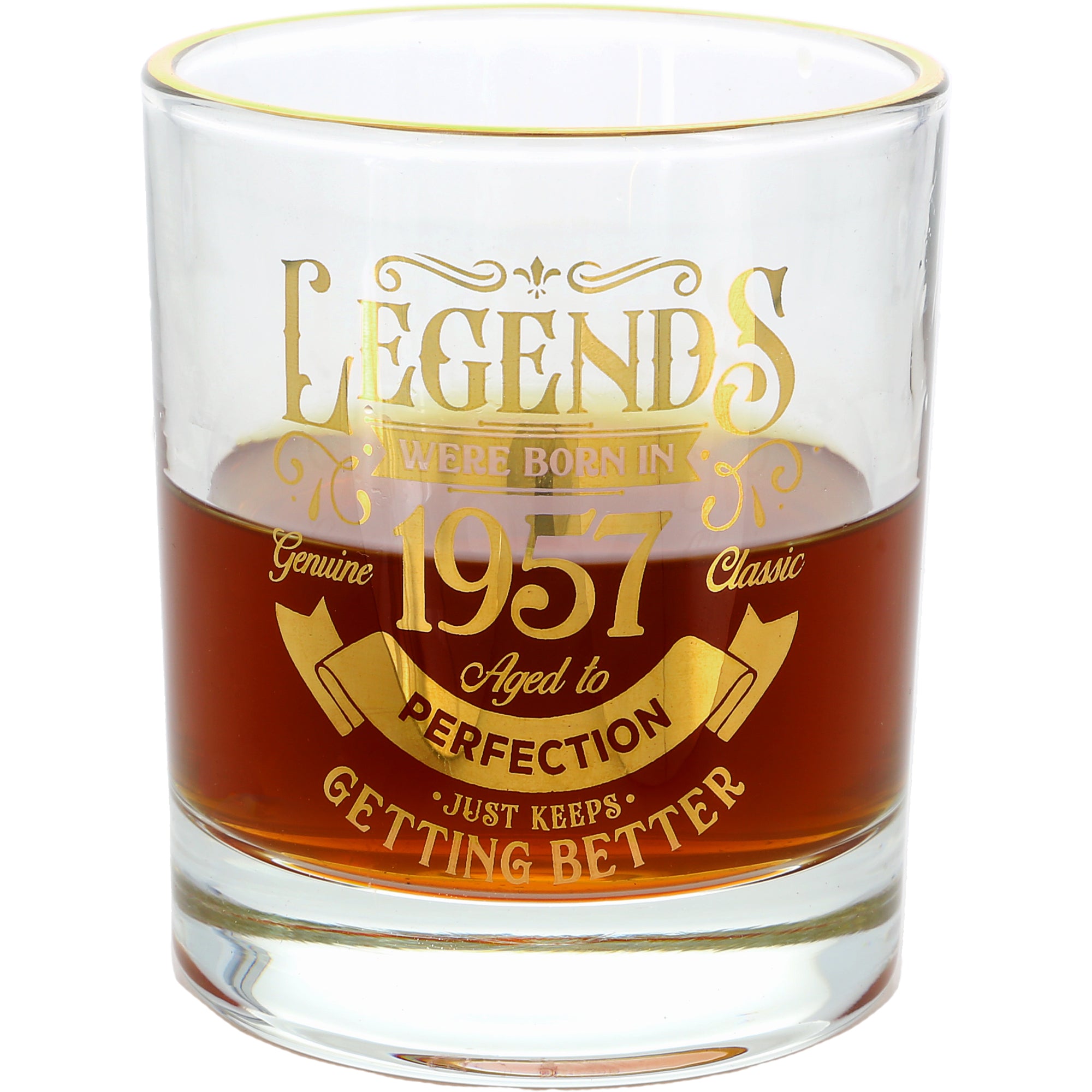 - IN-HOUSE DESIGN: The gold electroplated rim is accompanied by the gold "Legends Were Born In 1957, Genuine Classic, Aged To Perfection, Just Keeps Getting Better" sentiment decal on the front side of the whiskey along with banners and stars.