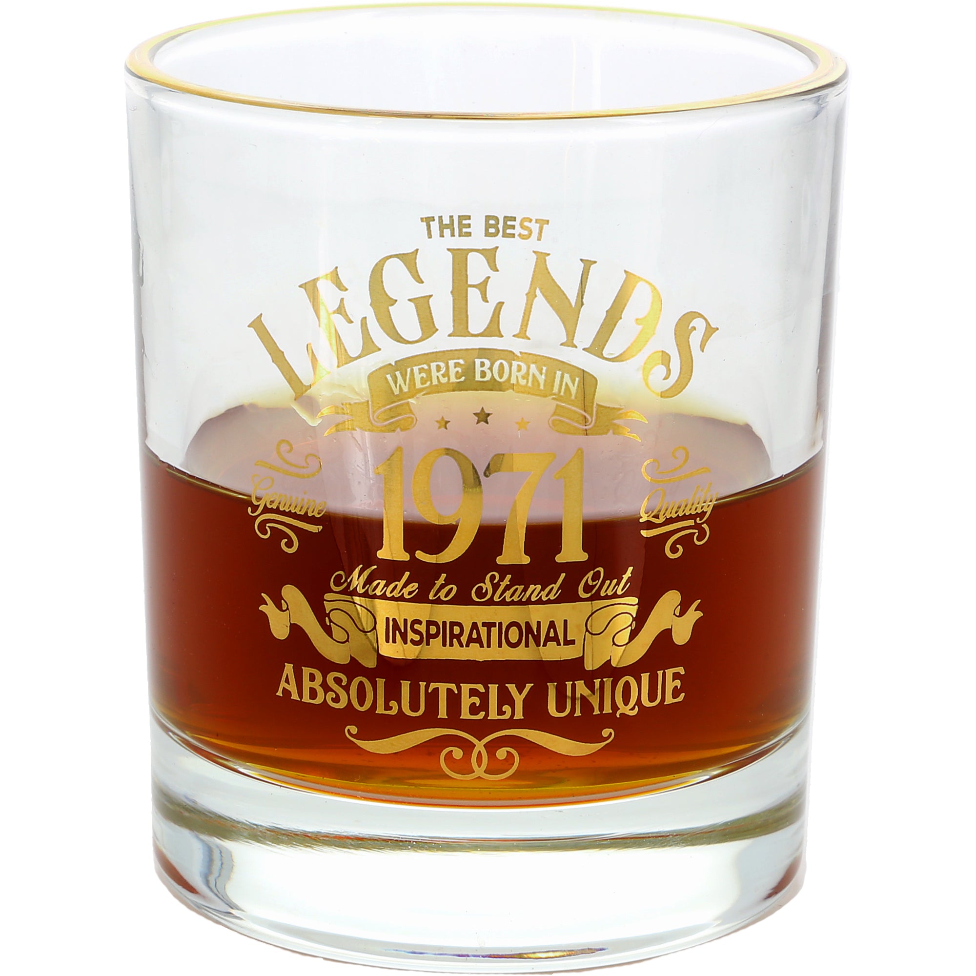 - IN-HOUSE DESIGN: The gold electroplated rim is accompanied by the gold "The Best Legends Were Born In 1971, Genuine Quality, Made To Stand Out, Inspirational, Absolutely Unique" sentiment decal on the front side of the whiskey along with banners and stars.