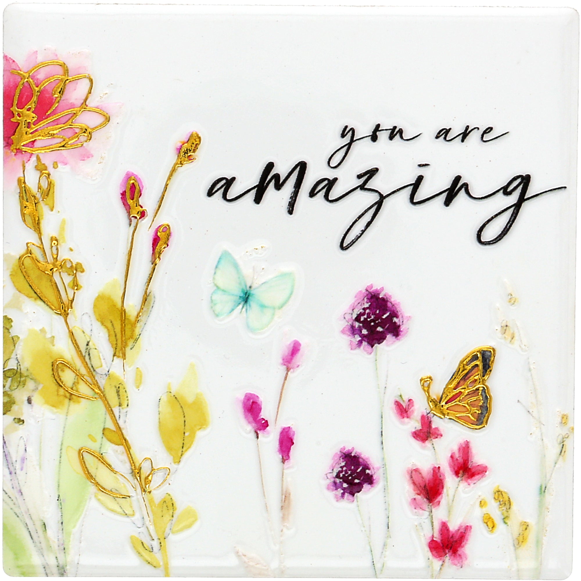 - PREMIUM QUALITY: Crafted from ceramic with a glossy finish, this 4" x 4" coaster features vibrant floral art, butterflies, and gold-embossed text reading “You are amazing.” The cork backing provides non-slip support and protects surfaces. The design combines artful color and gentle inspiration for everyday encouragement.