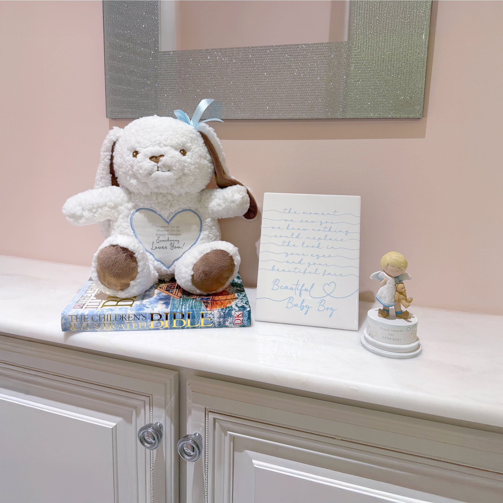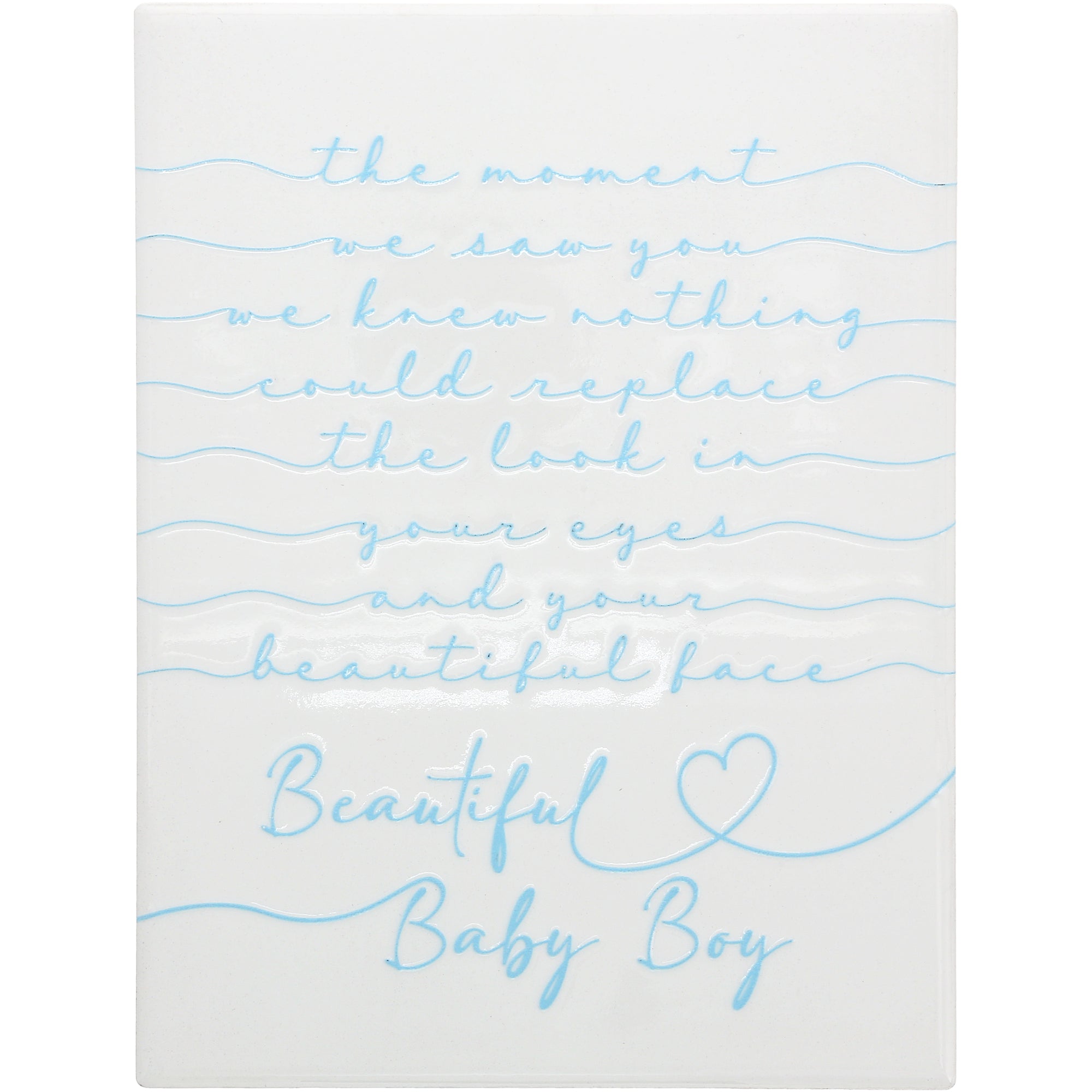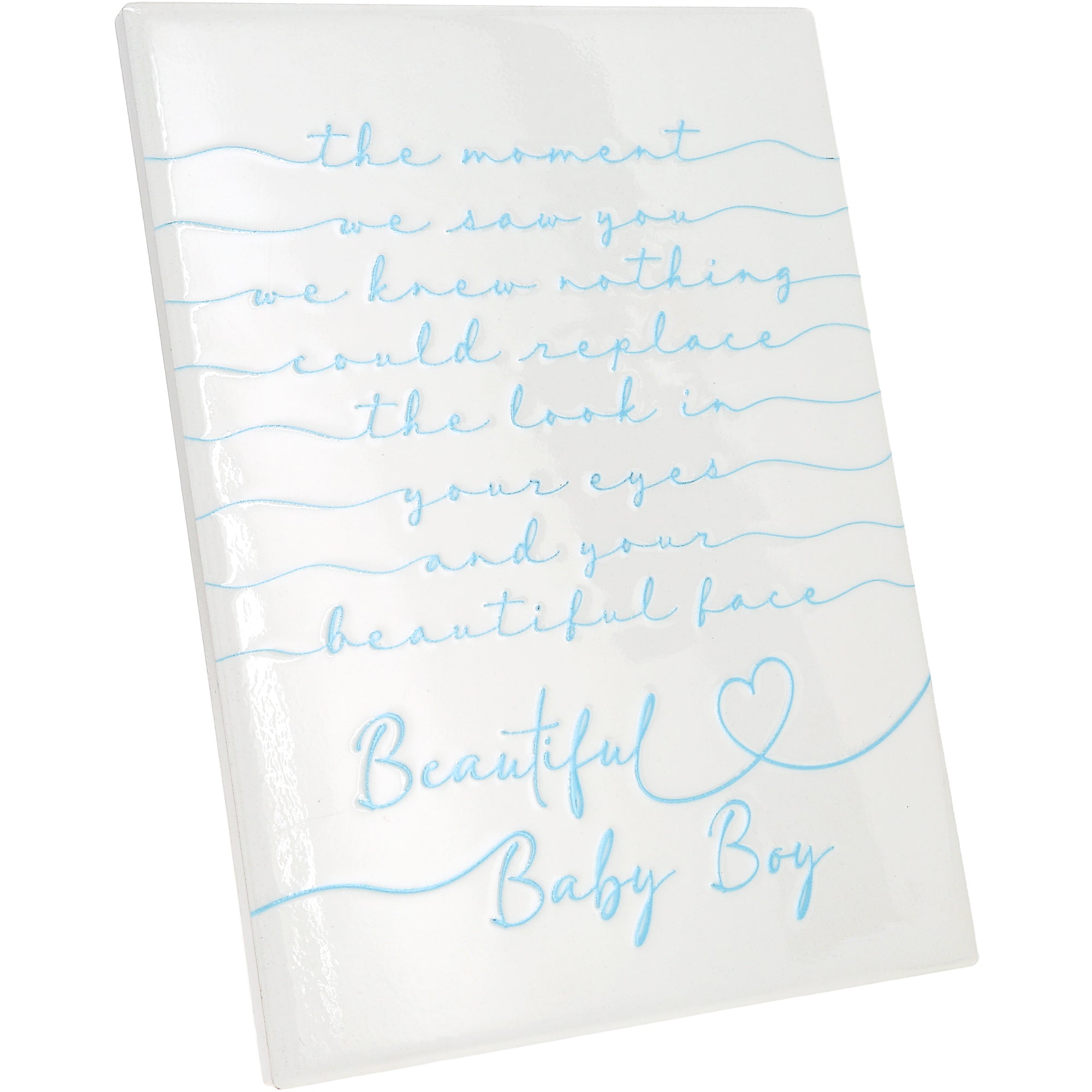 • PREMIUM QUALITY: Crafted from glossy white ceramic, this 6" x 8" easel-back plaque features raised and printed artwork in soft blue. The touching message reads, “The moment we saw you we knew nothing could replace the look in your eyes and your beautiful face – Beautiful Baby Boy.” Its clean design and smooth edges make it a timeless decorative accent for any nursery or family space. Comes packaged in a white die-cut box for easy gifting and safe storage.