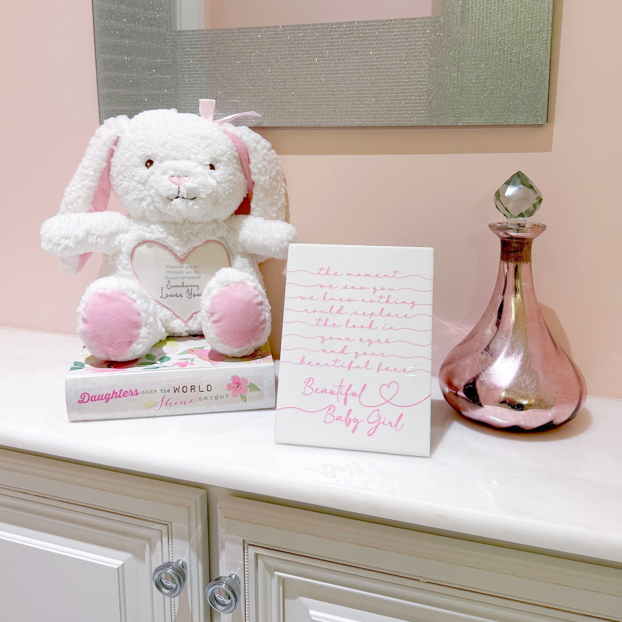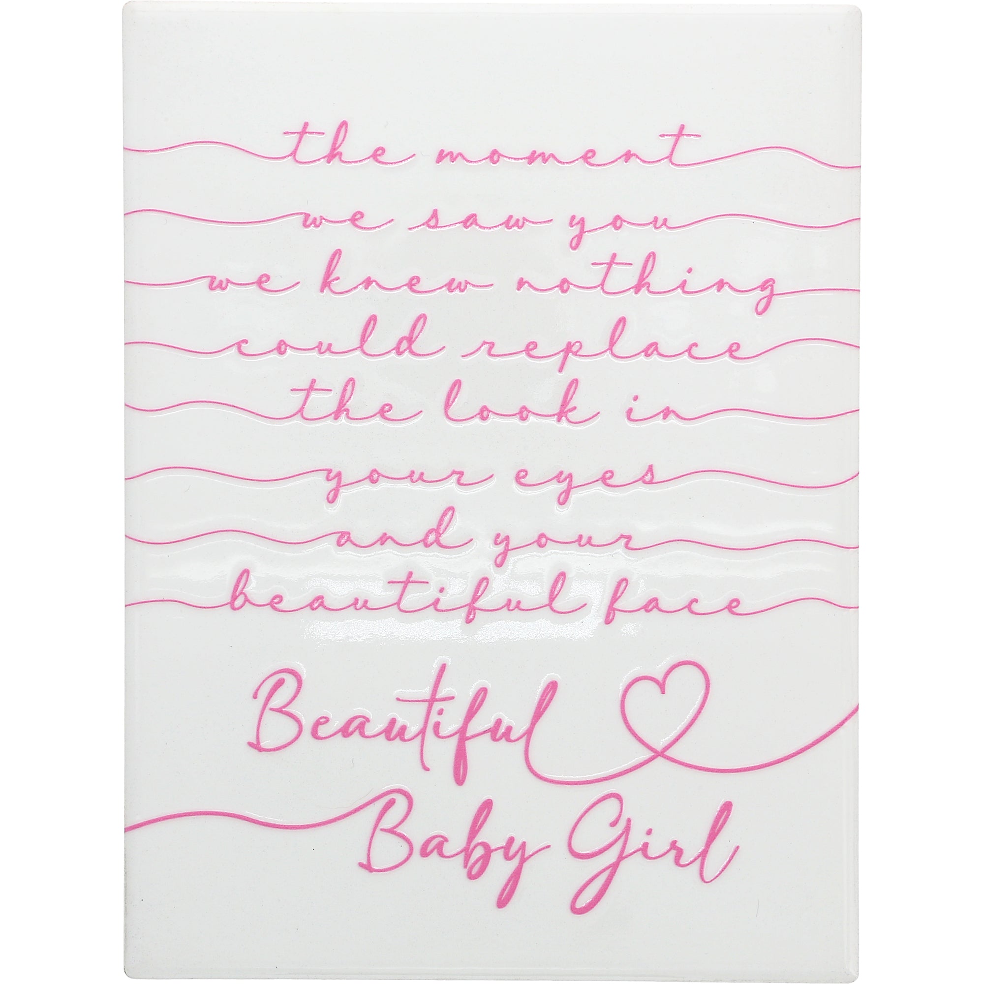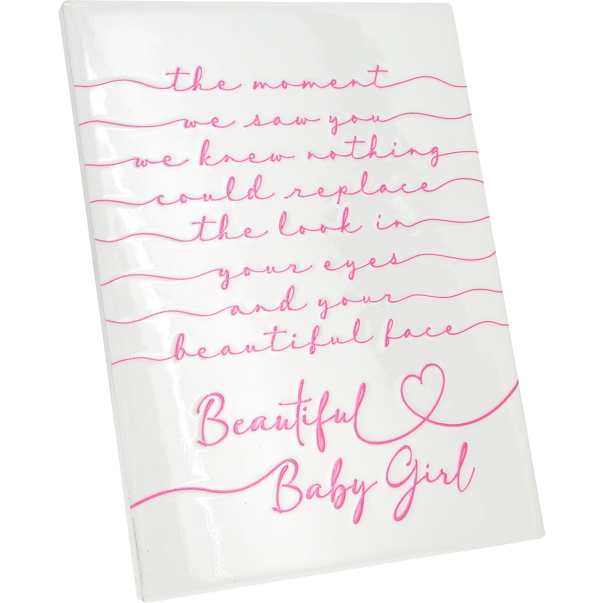 - PREMIUM QUALITY: This 6" x 8" easel-back ceramic plaque features a glossy white finish with raised and printed pink lettering. Made from durable ceramic with smooth rounded edges, it’s designed for tabletop display on dressers, shelves, or nursery accent tables. The heartfelt script reads, “The moment we saw you we knew nothing could replace the look in your eyes and your beautiful face – Beautiful Baby Girl.” Comes carefully packaged in a protective white die-cut box, making it gift-ready for new parents