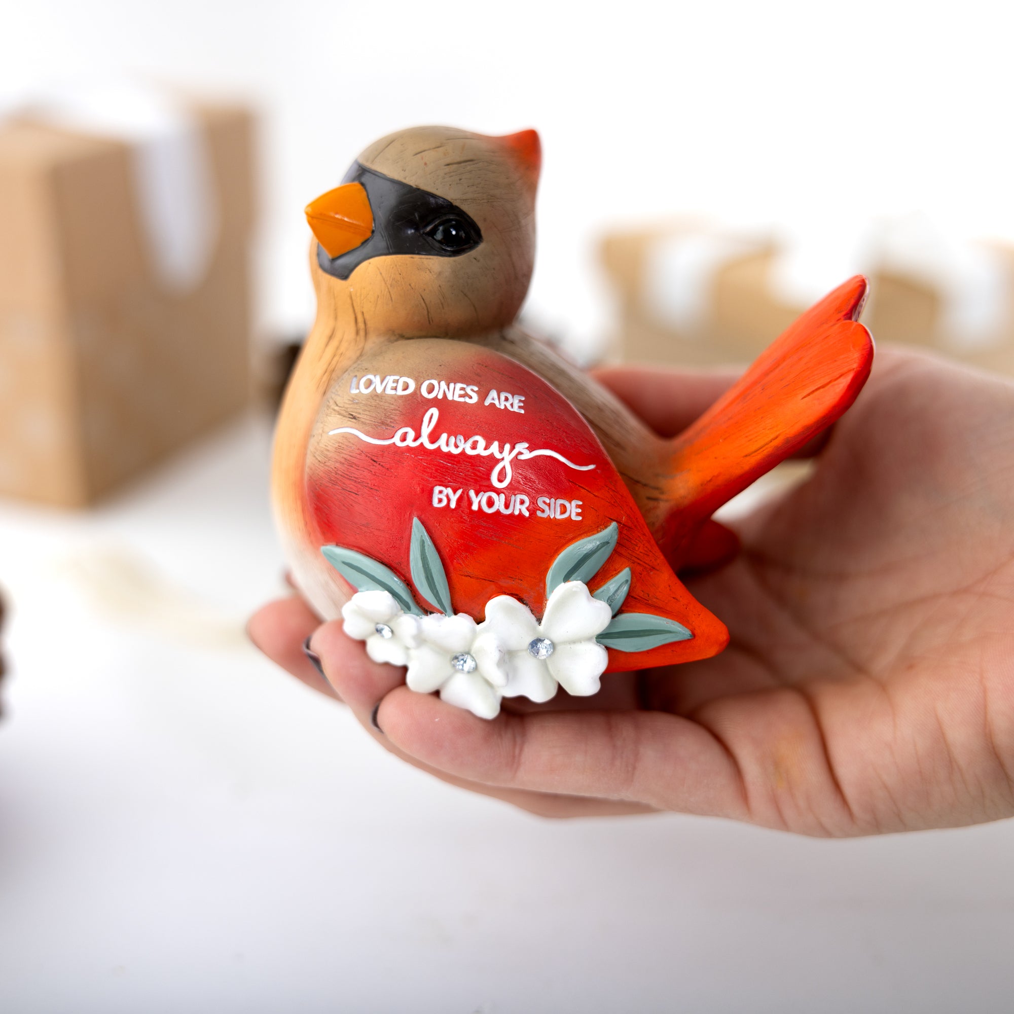 - IN-HOUSE DESIGN: The bird's black face has an orange beak, and the body has brown, red, white, and yellow accents. The white 3D flowers have crystal accents at the flower centers, with green 3D leaves surrounding them. The white "Loved Ones Are Always By Your Side" is debossed into the top of the bird's wing.