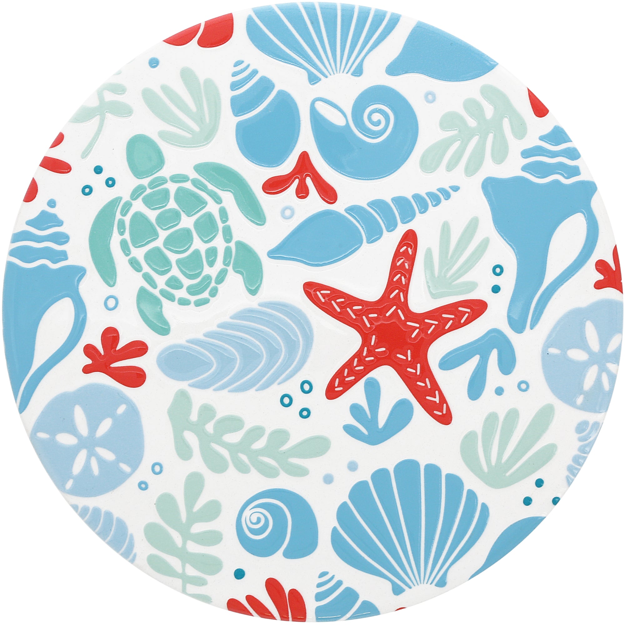 - PREMIUM QUALITY: This round decorative trivet is made from durable ceramic with a protective cork backing. The glossy, raised decal surface features colorful illustrations of seashells, coral, turtles, and starfish in aqua, coral, and turquoise tones. The cork base helps prevent scratches and sliding, while the ceramic top offers a bright, coastal-inspired shine. Each piece comes packaged in a white die-cut box for effortless gifting.