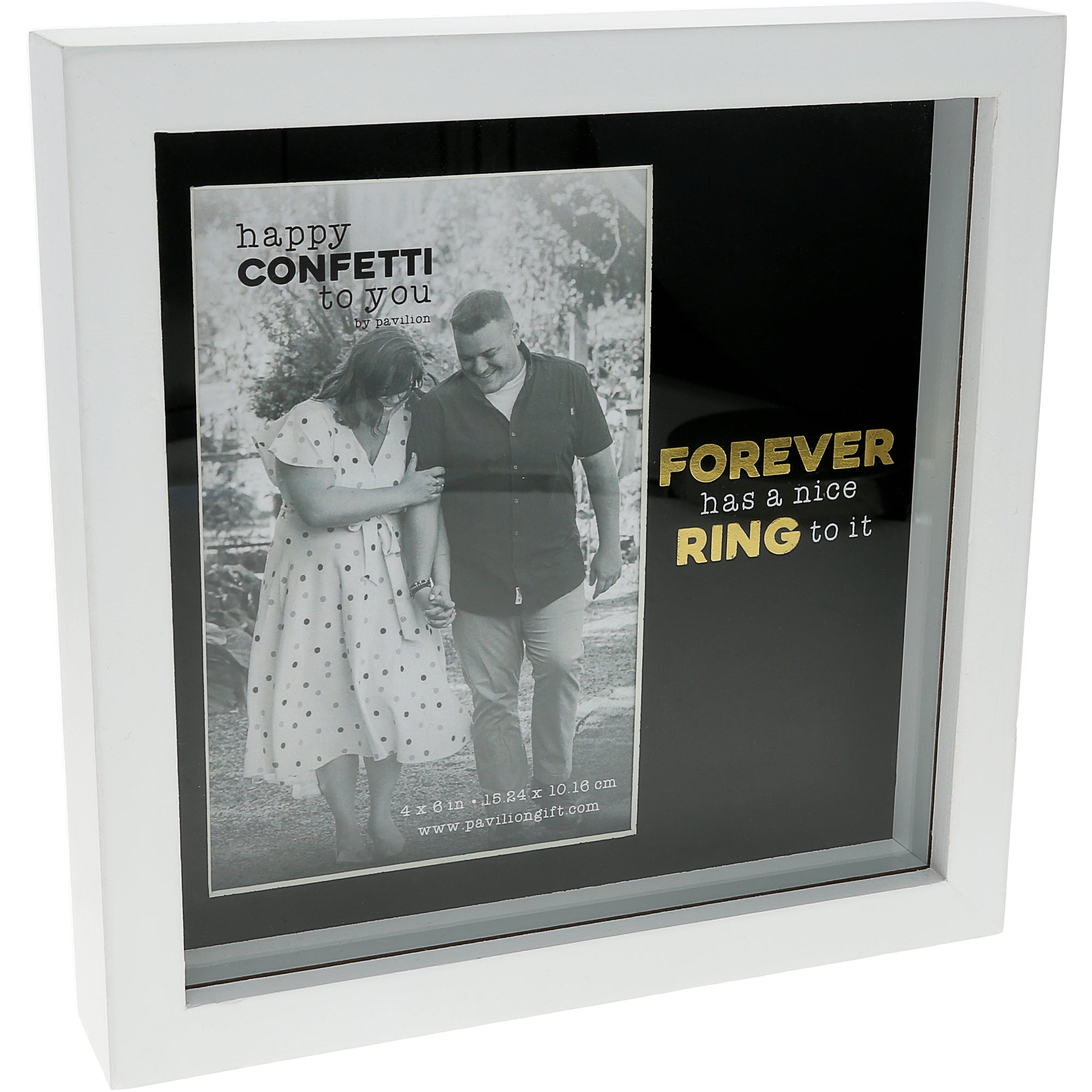 - PREMIUM QUALITY: This 7.5" x 7.5" shadowbox-style frame is crafted from MDF and glass, offering a clean, durable design with a modern white exterior. The frame holds a 4" x 6" photo and features debossed artwork on the black mat with bold yellow printed lettering on the glass for added visual depth. A built-in easel and sawtooth hanger make it easy to display on walls or tabletops.