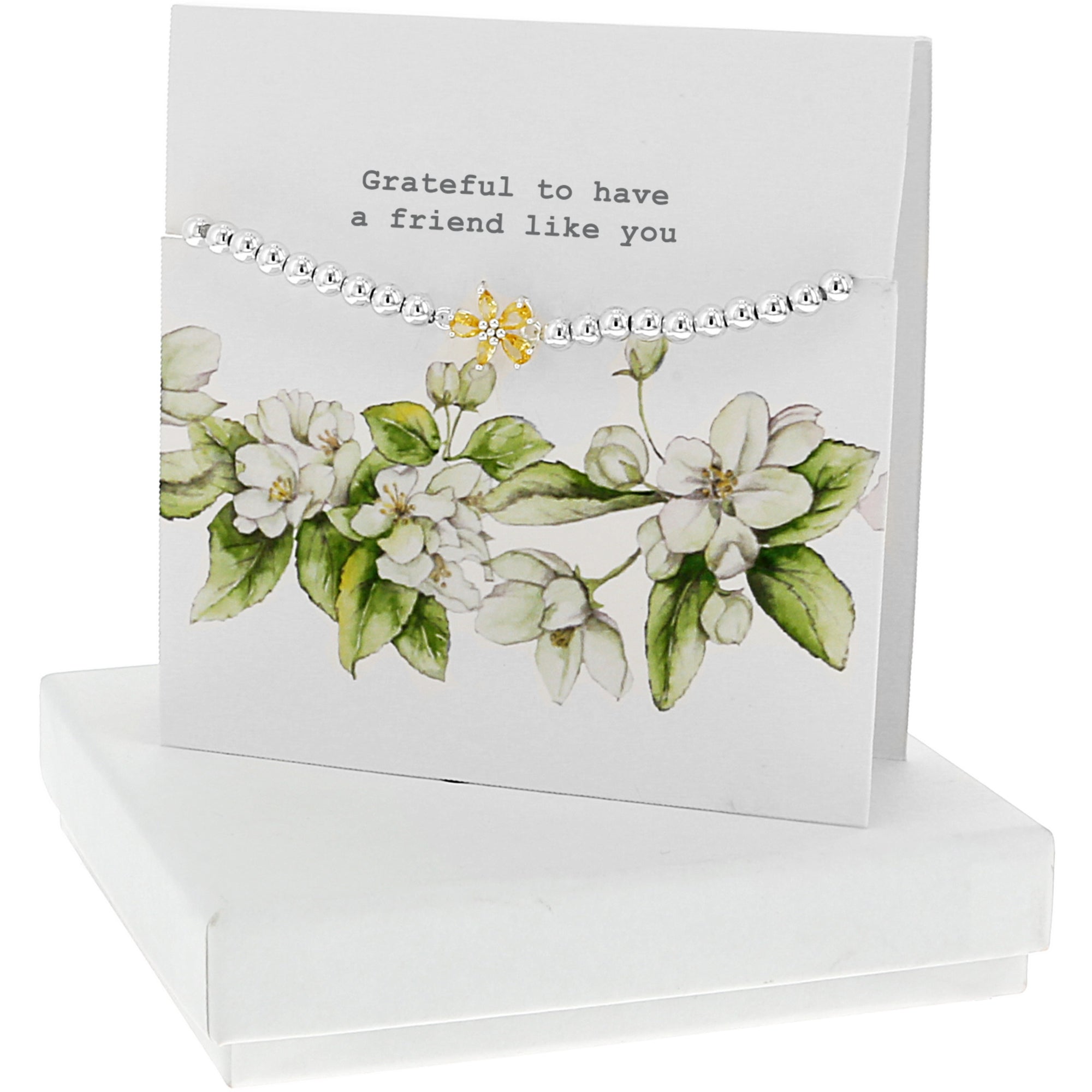 - PREMIUM QUALITY: This 3.25" x 3.25" card is crafted from durable, high-quality white paper and paired with a silver-plated CZ beaded stretch bracelet featuring a gold flower accent to symbolize gratitude. The bracelet is affixed securely to the card, and both are cushioned by a cotton pad within a custom Crumble & Core gift box, making it a thoughtful and polished presentation.