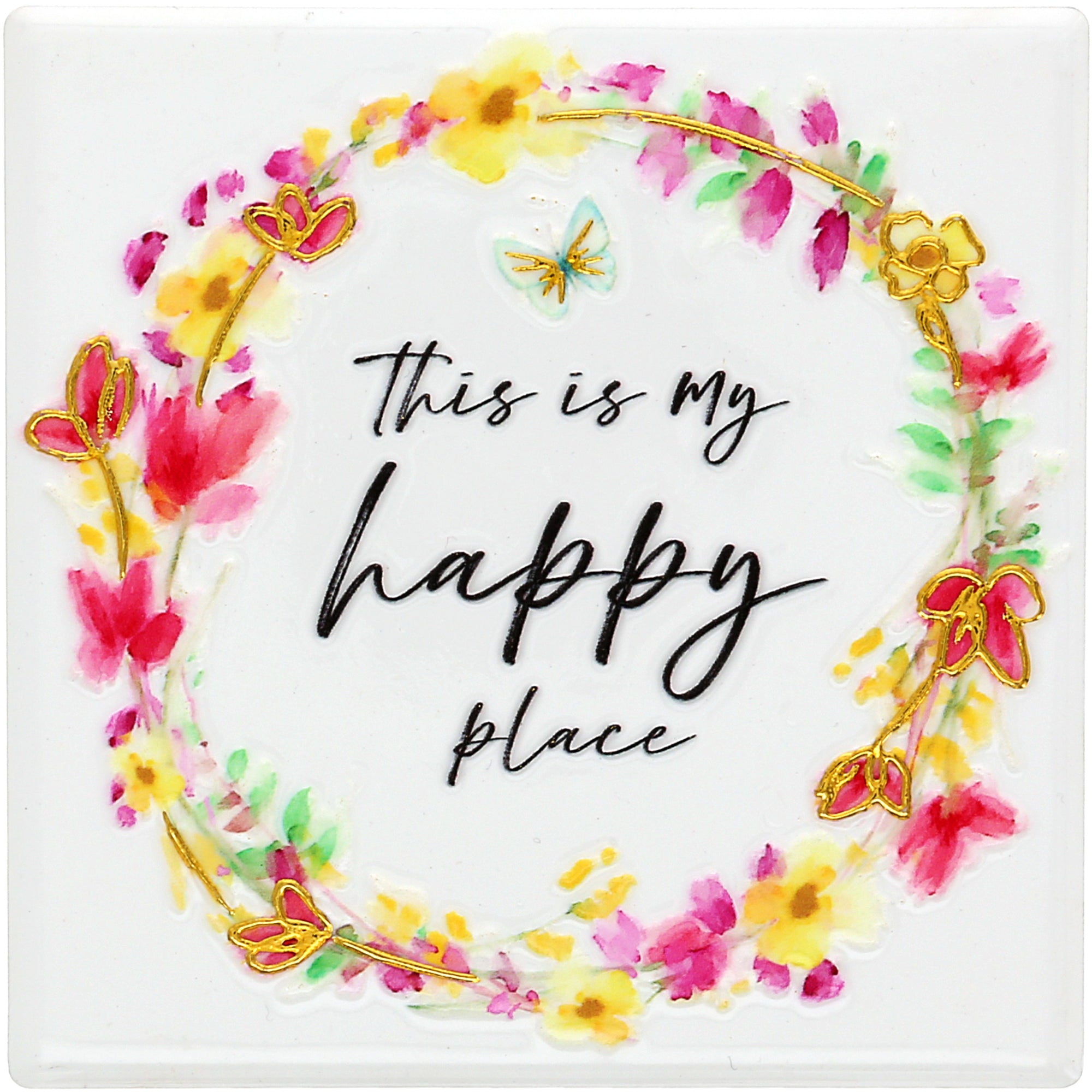 - PREMIUM QUALITY: Made from ceramic with a glossy, raised finish and gold accent text, this 4" x 4" coaster features a cheerful wreath of colorful florals surrounding the words “This is my happy place.” The cork backing adds stability and protection against scratches and spills.