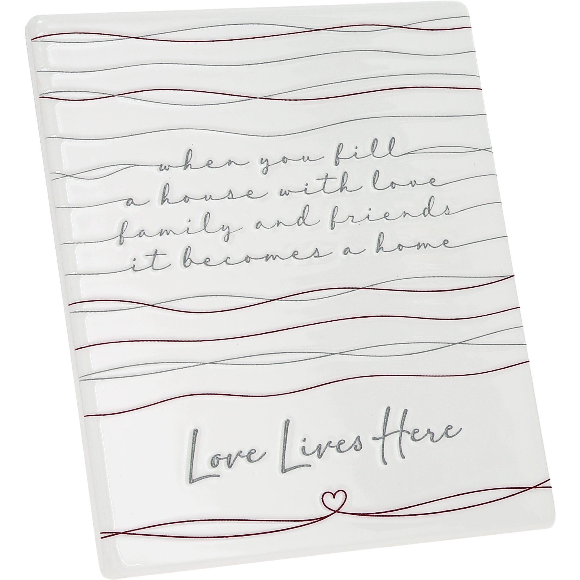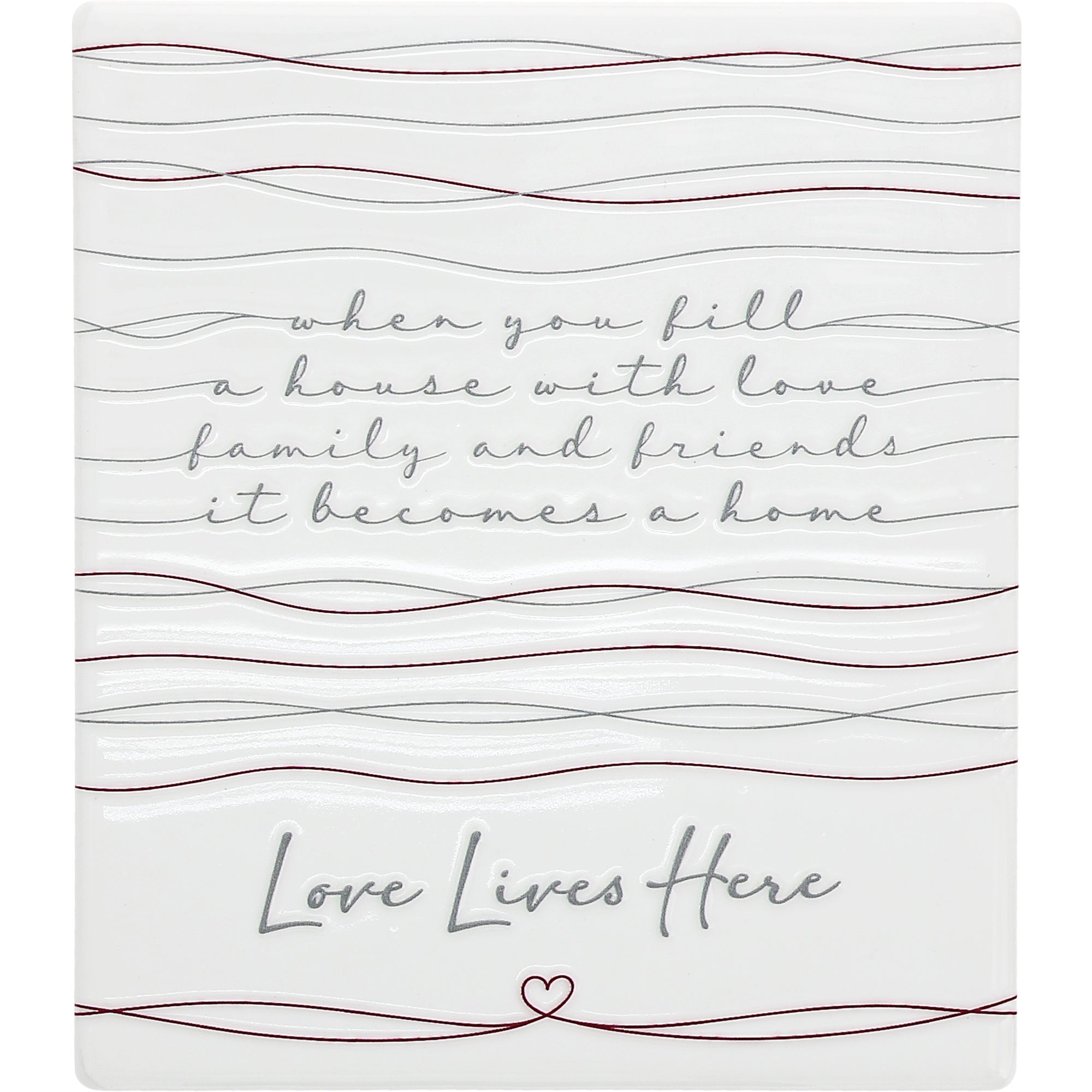 - IN-HOUSE DESIGN: Featuring thin maroon horizontal line art reminiscent of string or thread, the top portion displays the phrase “When you fill a house with love, family and friends, it becomes a home” in raised script lettering. The bottom sentiment “Love Lives Here” is printed in a soft gray cursive font, accompanied by a small heart icon beneath it.