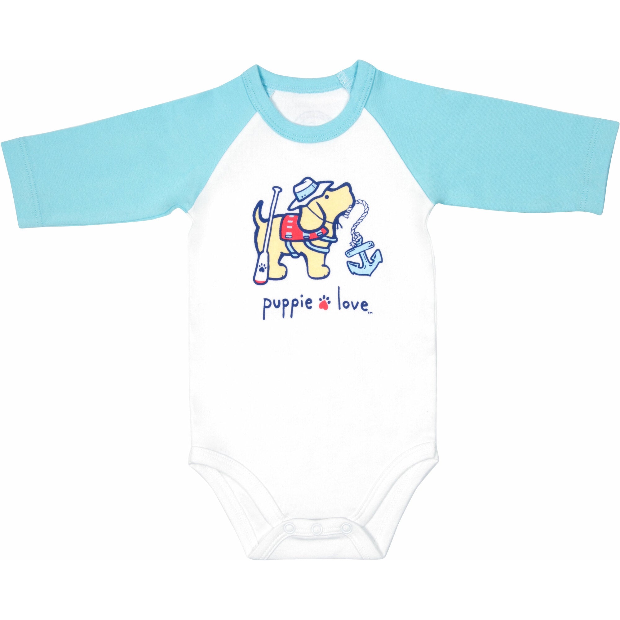 - IN-HOUSE DESIGN: "Puppie Love" text and accompanying dog icon with hat, oar, and anchor detailing are both printed onto the front of the bodysuit.